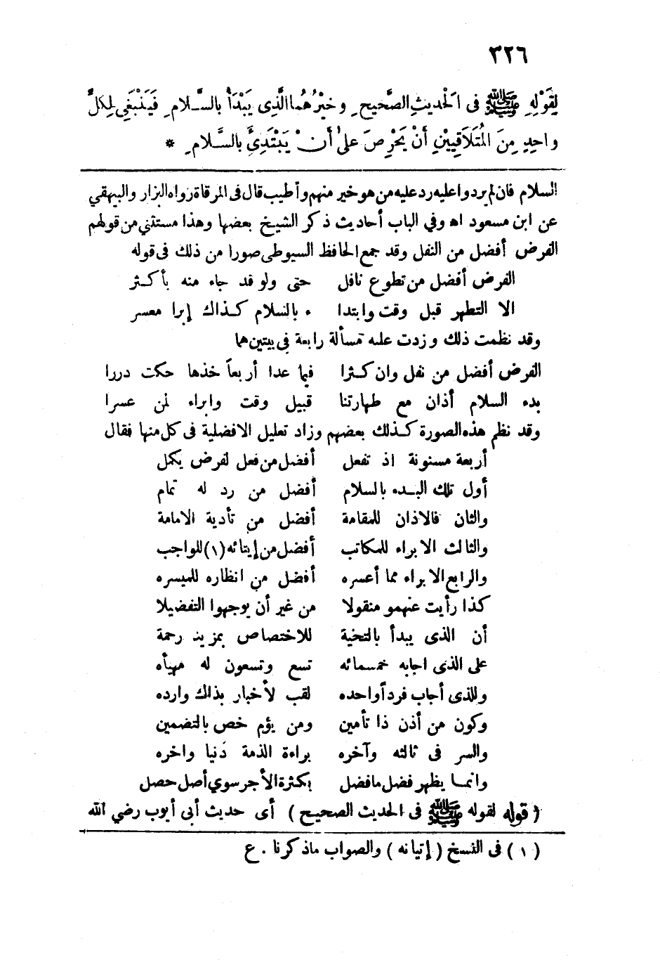 السلام فإن لم يردوا عليه رد عليه من هو خير منهم وأطيب قال في المرقاة: رواه البزار والبيهقي عن ابن مسعود اهـ وفي الباب أحاديث ذكر الشيخ بعضها وهذا مستثنى من قولهم الفرض أفضل من النفل وقد جمع الحافظ السيوطي صوراً من ذلك في قوله:
