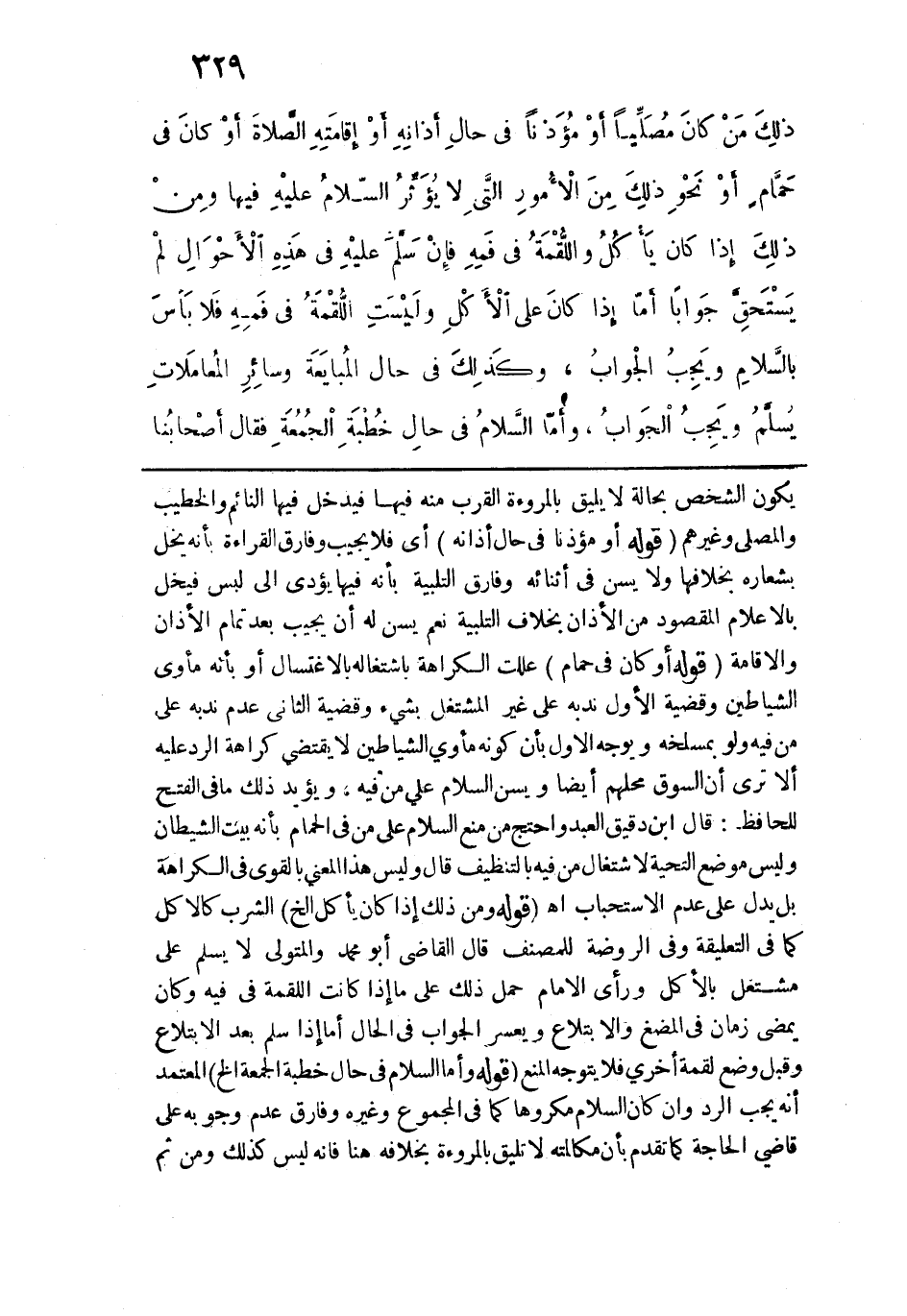 يكون الشخص بحالة لا يليق بالمروءة القرب منه فيها فيدخل فيها النائم والخطيب والمصلي وغيرهم. قوله: (أو مؤذناً في حال أذانه) أي فلا يجيب وفارق القراءة بأنه يخل بشعاره بخلافها ولا يسن في أثنائه وفارق التلبية بأنه فيها يؤدي إلى لبس فيخل بالإعلام المقصود من الأذان بخلاف التلبية نعم يسن له أن يجيب بعد تمام الأذان والإقامة. قوله: (أو كان في حمام) عللت الكراهة باشتغاله بالاغتسال أو بأنه مأوى الشياطين وقضية الأول ندبه على غير المشتغل بشيء وقضية الثاني عدم ندبه على من فيه ولو بمسلخه ويوجه الأول بأن كونه مأوى الشياطين لا يقتضي كراهة الرد عليه ألا ترى أن السوق محلهم أيضاً ويسن السلام على من فيه، ويؤيد ذلك ما في الفتح للحافظ: قال ابن دقيق العيد واحتج من منع السلام على من في الحمام بأنه بيت الشيطان وليس موضع التحية لاشتغال من فيه بالتنظيف قال: وليس هذا المعنى بالقوي في الكراهة بل يدل على عدم الاستحباب اهـ. قوله: (ومن ذلك إذا كان يأكل الخ) الشرب كالأكل كما في التعليقة وفي الروضة للمصنف قال القاضي أبو محمد والمتولي لا يسلم على مشتغل بالأكل ورأى الإِمام حمل ذلك على ما إذا كانت اللقمة في فيه وكان يمضي زمان في المضغ والابتلاع ويعسر الجواب في الحال أما إذا سلم بعد الابتلاع وقبل وضع لقمة أخرى فلا يتوجه المنع. قوله: (وأما السلام في حال الجمعة الخ) المعتمد أنه يجب الرد وإن كان السلام مكروهاً كما في المجموع وغيره وفارق عدم وجوبه على قاضي الحاجة كما تقدم بأن مكالمته لا تليق بالمروءة بخلافه هنا فإنه ليس كذلك ومن ثم