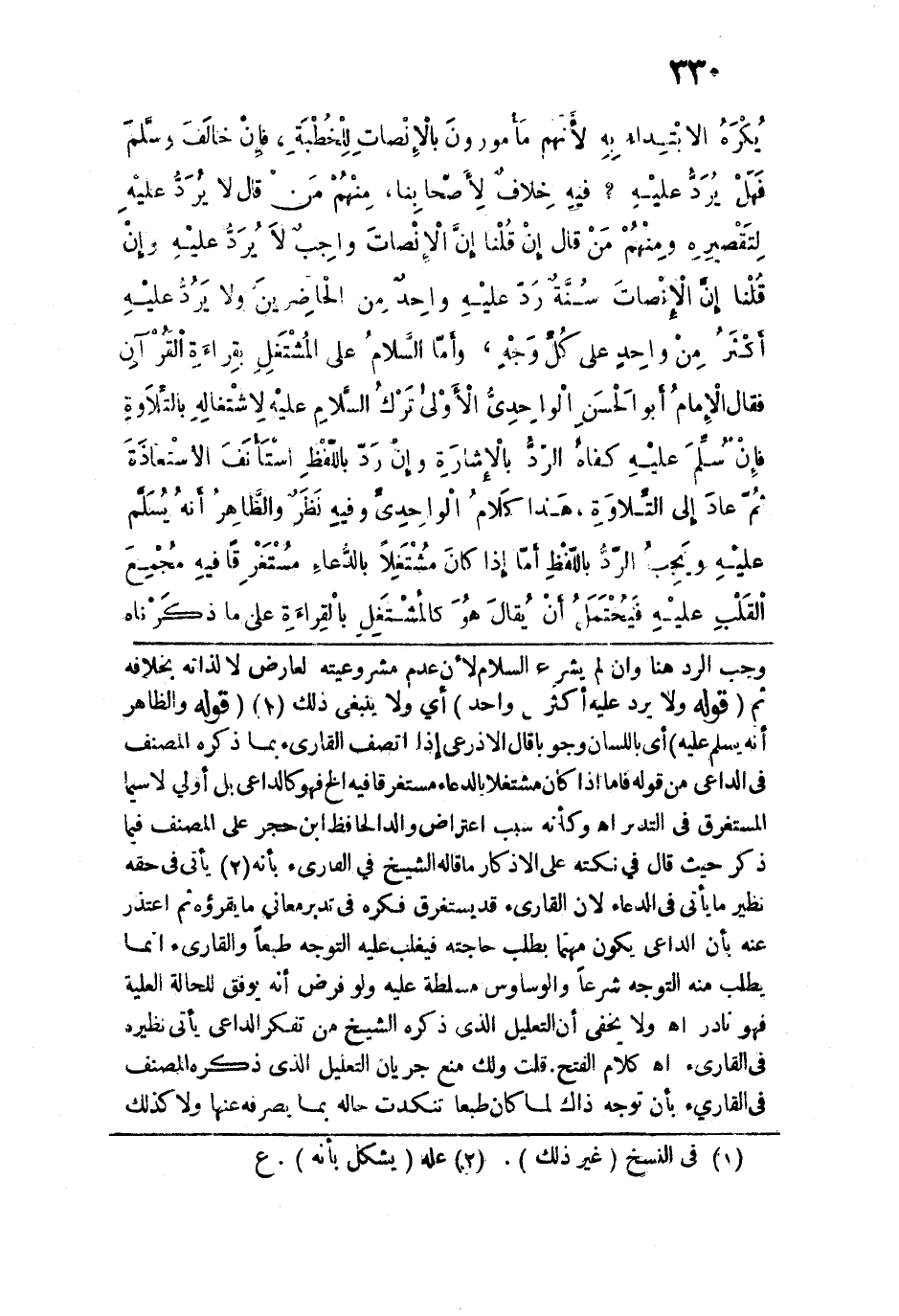وأما السلام على المشتغل بقراءة القرآن، فقال الإِمام أبو الحسن الواحدي: الأولى ترك السلام عليه لاشتغاله بالتلاوة، فإن سلم عليه كفاه الرد بالإشارة، وإن رد باللفظ استأنف الاستعاذة ثم عاد إلى التلاوة، هذا كلام الواحدي، وفيه نظر، والظاهر أنه يسلم عليه ويجب الرد باللفظ. أما إذا كان مشتغلاً بالدعاء، مستغرقاً فيه، مجمعَ القلب عليه، فيحتمل أن يقال: هو كالمشتغل بالقراءة على ما ذكرناه،