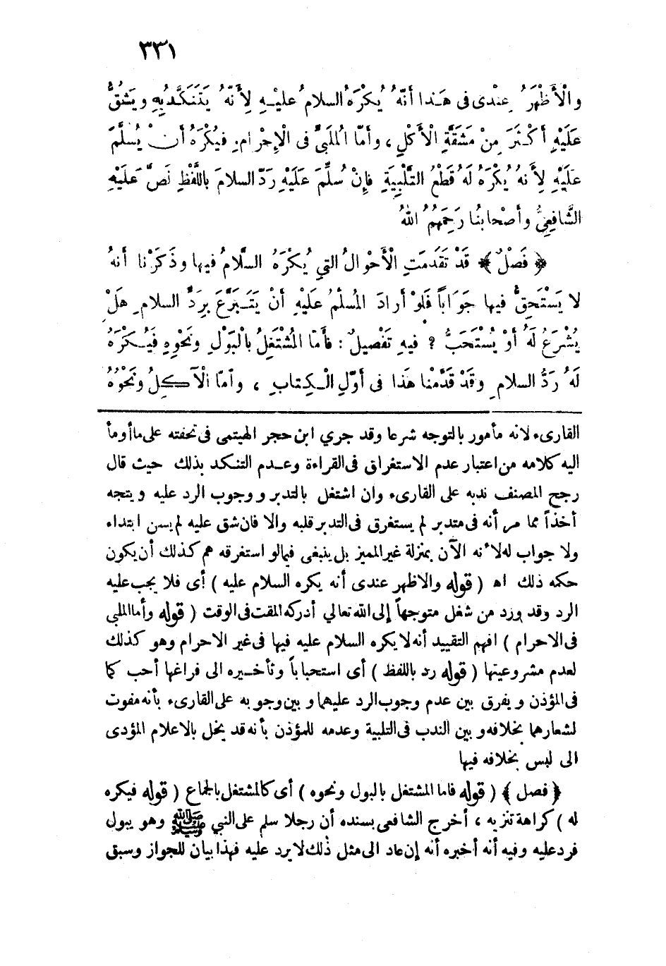 قوله: (فأما المشتغل بالبول ونحوه) أي كالمشتغل بالجماع. قوله: (فيكره له) كراهة تنزيه،