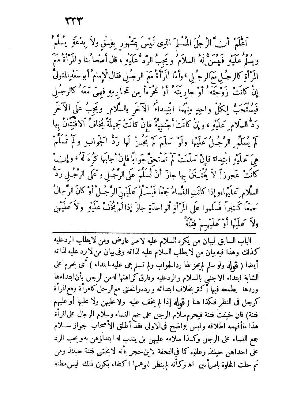 اعلم أن الرجل المسلم الذي ليس بمشهور بفسق ولا بدعة يسلِّم ويسلَّم عليه، فيسن له السلام ويجب الرد عليه. قال أصحابنا: والمرأة مع المرأة كالرجل مع الرجل. وأما المرأة مع الرجل، فقال الإِمام أبو سعد المتولي: إن كانت زوجته أو جاريته أو مَحرَماً من محارمه، فهي معه كالرجل مع الرجل، فيستحب لكل واحد منهما ابتداء الآخر بالسلام، ويجب من الآخر رد السلام عليه، وإن كانت أجنبية، فإن كانت جميلة يخاف الافتتان بها لم يسلِّم الرجل عليها، ولو سلم، لم يجز لها رد الجواب ولم تسلِّم هي عليه ابتداءً، فإن سلَّمت، لم تستحق جواباً، فإن أجابها كره له، وإن كانت عجوزاً لا يفتتن بها، جاز أن تسلِّم على الرجل، وعلى الرجل رد السلام عليها، وإذا كانت النساء جمعاً، فيسلِّم عليهنَّ الرجل، أو كان الرجال جمعاً كثيراً، فسلَّموا على المرأة الواحدة جاز إذا لم يُخفْ عليه ولا عليهن ولا عليها ولا عليهم فتنة.