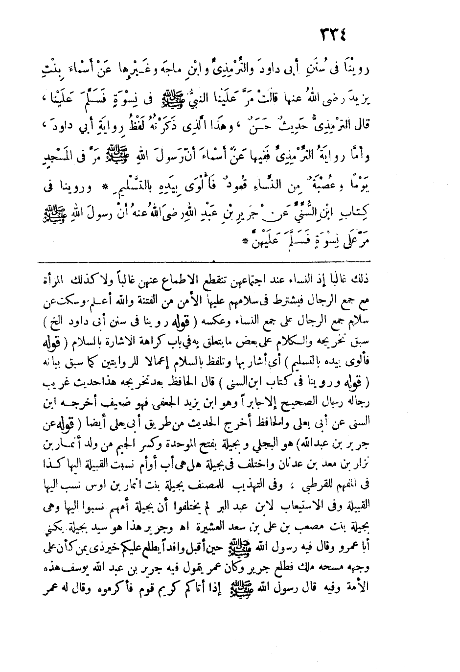 وروينا في كتاب ابن السني عن جرير بن عبد الله رضي الله عنه "أن رسول -صلى الله عليه وسلم- مر على نسوة فسلم عليهن".