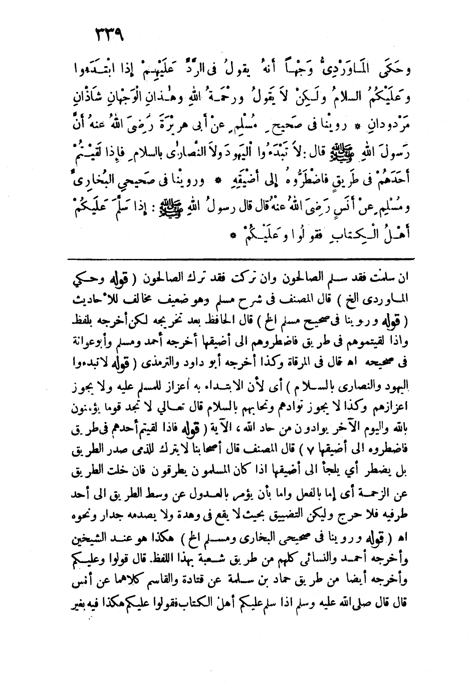 قوله: (وروينا في صحيح مسلم الخ) قال الحافظ بعد تخريجه لكن أخرجه بلفظ وإذا لقيتموهم في طريق فاضطروهم إلى أضيقها أخرجه أحمد ومسلم وأبو عوانة في صحيحه اهـ. قال في المرقاة وكذا أخرجه أبو داود والترمذي. قوله: (لا تبدؤوا اليهود والنصارى بالسلام) أي لأن الابتداء به إعزاز للمسلم عليه ولا يجوز إعزازهم وكذا لا يجوز توادهم وتحابهم بالسلام قال تعالى: {لَا تَجِدُ قَوْمًا يُؤْمِنُونَ بِاللَّهِ وَالْيَوْمِ الْآخِرِ يُوَادُّونَ مَنْ حَادَّ اللهَ}، الآية. قوله: (فإذا لقيتم أحدهم في طريق فاضطروه إلى أضيقها) قال المصنف قال أصحابنا: لا يترك للذمي صدر الطريق بل يضطر أي يلجأ إلى أضيقها إذا كان المسلمون يطرقون فإن خلت الطريق عن الزحمة أي إما بالفعل وإما بأن يؤمر بالعدول عن وسط الطريق إلى أحد طرفيه فلا حرج وليكن التضييق بحيث لا يقع في وهدة ولا يصدمه جدار ونحوه اهـ.