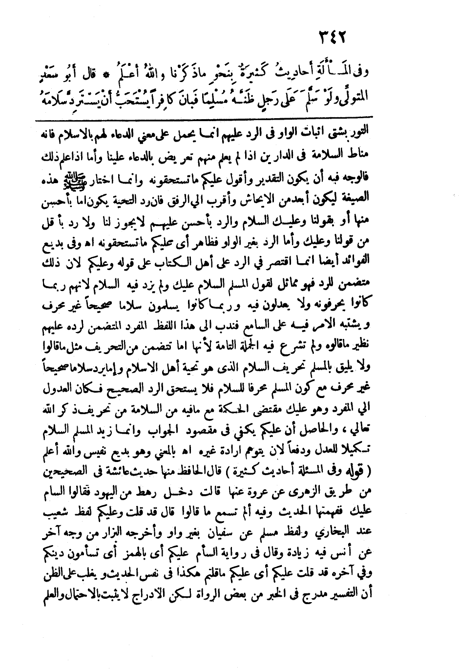 التوربشتي: إثبات الواو في الرد عليهم إنما يحمل على معنى الدعاء لهم بالإسلام فإنه مناط السلامة في الدارين إذا لم يعلم منهم تعريض بالدعاء علينا وأما إذا علم ذلك فالوجه فيه أن يكون التقدير وأقول عليكم ما تستحقونه وإنما اختار -صلى الله عليه وسلم- هذه الصيغة ليكون أبعد من الإيحاش وأقرب إلى الرفق فإن رد التحية يكون إما بأحسن منها أو بقولنا: وعليك السلام والرد بأحسن عليهم لا يجوز لنا ولا رد بأقل من قولنا: وعليك وأما الرد بغير الواو فظاهر أي عليكم ما تستحقونه اهـ. وفي بديع الفوائد أيضاً إنما اقتصر في الرد علي أهل الكتاب على قوله وعليكم لأن ذلك متضمن للرد فهو مماثل لقول المسلم: السلام عليك ولم يزد فيه السلام لأنهم ربما كانوا يحرفونه ولا يعدلون فيه وربما كانوا يسلمون سلاماً صحيحاً غير محرف ويشتبه الأمر فيه على السامع فندب إلى هذا اللفظ المفرد المتضمن لرده عليهم نظير ما قالوه ولم تشرع فيه الجملة التامة لأنها إما تتضمن من التحريف مثل ما قالوا ولا يليق بالمسلم تحريف السلام الذي هو تحية أهل الإسلام وإما يرد سلاماً صحيحاً غير محرف مع كون المسلم محرفاً للسلام فلا يستحق الرد الصحيح فكان العدول إلى المفرد وهو عليك مقتضى الحكمة مع ما فيه من السلامة من تحريف ذكر الله تعالى، والحاصل أن عليكم يكفي في مقصود الجواب وإنما زيد المسلم السلام تكميلاً للعدل ودفعاً لأن يتوهم إرادة غيره اهـ. بالمعنى وهو بديع نفيس والله أعلم. قوله: (وفي المسألة أحاديث كثيرة) قال الحافظ منها حديث عائشة في الصحيحين من طريق الزهري عن عروة عنها قالت: دخل وهي من اليهود فقالوا: السام عليك ففهمتها الحديث وفيه ألم تسمع ما
