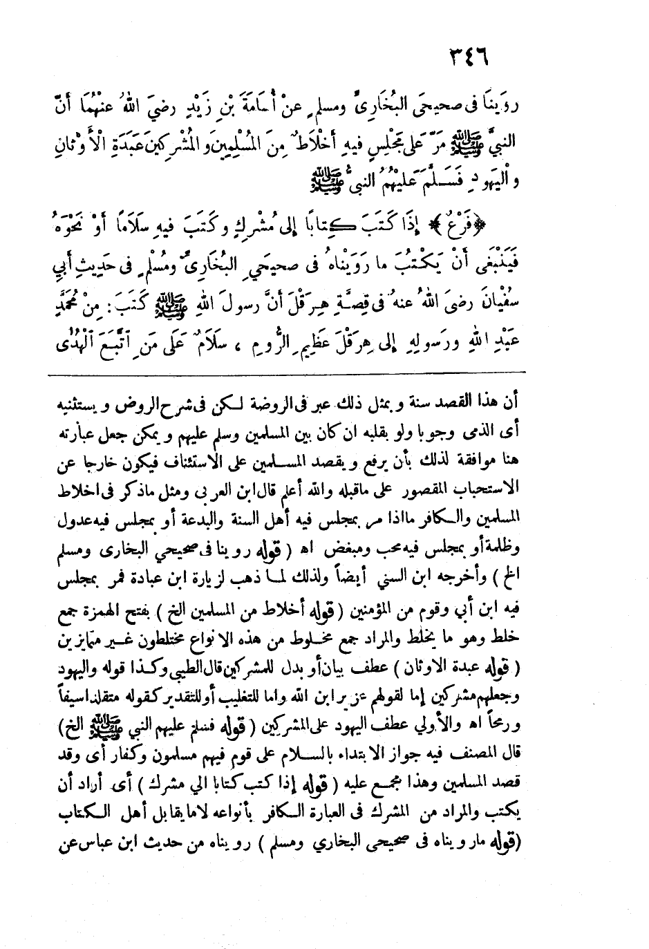 قوله: (روينا في صحيحي البخاري ومسلم الخ) وأخرجه ابن السني أيضاً ولذلك لما ذهب لزيارة ابن عبادة فمر بمجلس فيه ابن أبي وقوم من المؤمنين. قوله: (أخلاط من المسلمين الخ) بفتح الهمز جمع خلط وهو ما يخلط والمراد جمع مخلوط من هذه الأنواع مختلطون غير متمايزين. قوله: (عبدة الأوثان) عطف بيان أو بدل للمشركين قال الطيبي وكذا قوله واليهود وجعلهم مشركين إما لقولهم عزير ابن الله وإما للتغليب أو للتقدير كقوله متقلداً سيفاً ورمحاً اهـ والأولى عطف اليهود على المشركين. قوله: (فسلم عليهم النبي -صلى الله عليه وسلم- الخ) قال المصنف: فيه جواز الابتداء بالسلام على قوم فيهم مسلمون وكفار أي وقد قصد المسلمين وهذا مجمع عليه. قوله: (إذا كتب كتاباً إلى مشرك) أي أراد أن يكتب والمراد من المشرك في العبارة الكافر بأنواعه لا ما يقابل أهل الكتاب. قوله: (ما رويناه في صحيحي البخاري ومسلم) رويناه من حديث ابن عباس عن