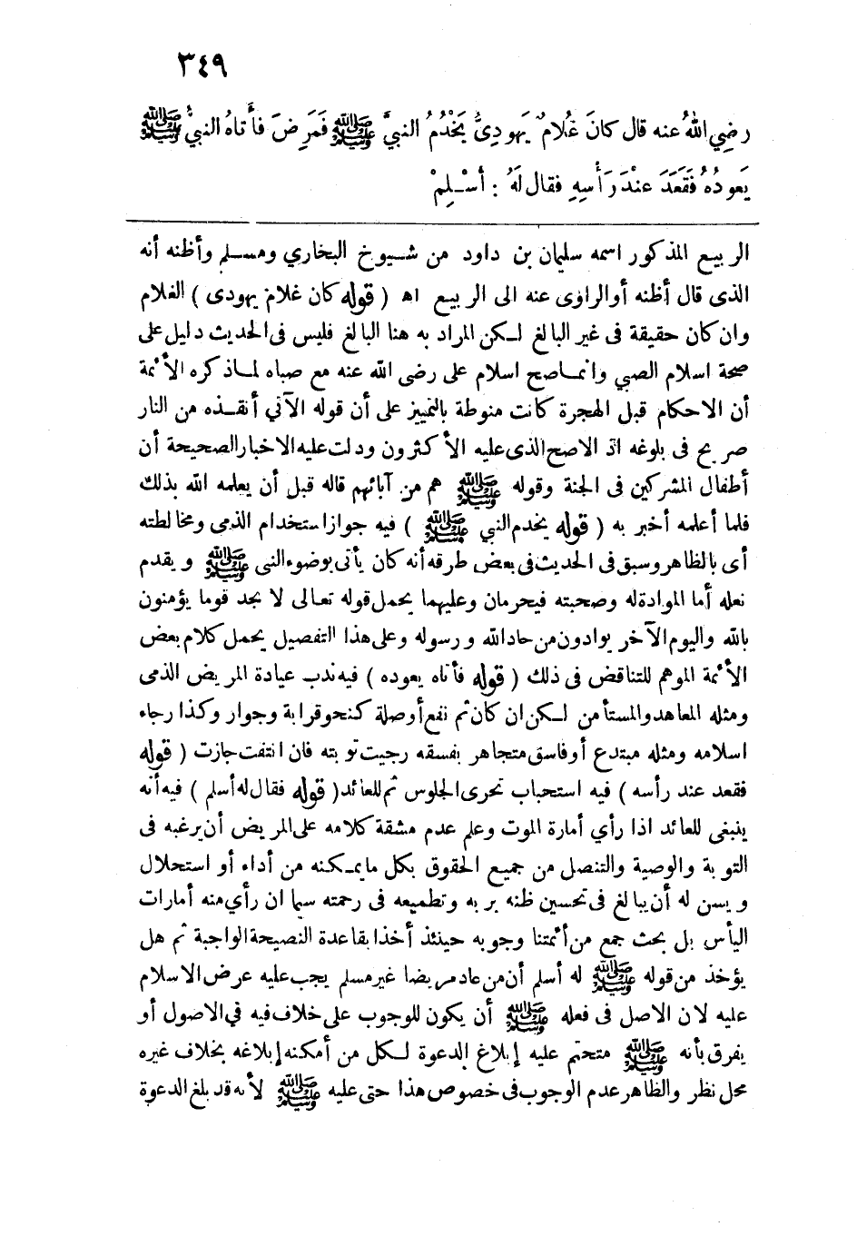 الربيع المذكور اسمه سليمان بن داود مر شيوخ البخاري ومسلم وأظنه أنه الذي قال أظنه أو الراوي عنه إلى الربيع اهـ. قوله: (كان غلام يهودي) الغلام وإن كان حقيقة في غير البالغ لكن المراد به هنا البالغ فليس في الحديث دليل على صحة إسلام الصبي وإنما صح إسلام علي رضي الله عنه مع صباه لما ذكره الأئمة أن الأحكام قبل الهجرة كانت منوطة بالتمييز على أن قوله الآتي: أنقذه من النار صريح في بلوغه إذ الأصح الذي عليه الأكثرون ودلت عليه الأخبار الصحيحة أن أطفال المشركين في الجنة وقوله -صلى الله عليه وسلم-: "هم من آبائهم" قاله قبل أن يعلمه الله بذلك فلما أعلمه أخبر به. قوله: (يخدم النبي -صلى الله عليه وسلم-) فيه جواز استخدام الذمي ومخالطته أي بالظاهر وسبق في الحديث في بعض طرقه أنه كان يأتي بوضوء النبي -صلى الله عليه وسلم- ويقدم نعله أما الموادة له وصحبته فيحرمان وعليهما يحمل قوله تعالى: {لَا تَجِدُ قَوْمًا يُؤْمِنُونَ بِاللَّهِ وَالْيَوْمِ الْآخِرِ يُوَادُّونَ مَنْ حَادَّ اللهَ وَرَسُولَهُ} وعلى هذا التفصيل يحمل كلام بعض الأئمة الموهم للتناقض في ذلك. قوله: (فأتاه يعوده) فيه ندب عيادة المريض الذمي ومثله المعاهد والمستأمن لكن إن كان ثم نفع أو صلة كنحو قرابة وجوار وكذا رجاء إسلامه ومثله مبتدع أو فاسق متجاهر بفسقه رجيت توبته فإن انتفت جازت. قوله: (فقعد عند رأسه) فيه استحباب تحري الجلوس ثم للعائد. قوله: (فقال له: أسلم) فيه أنه ينبغي للعائد إذا رأى أمارة الموت وعلم عدم مشقة كلامه على المريض أن يرغبه في التوبة والوصية والتنصل من جميع الحقوق بكل ما يمكنه من أداء أو استحلال ويسن له أن يبالغ في تحسين ظنه بربه وتطميعه في رحمته سيما إن رأى منه أمارات اليأس بل بحث جمع من أئمتنا وجوبه حينئذ أخذًا بقاعدة النصيحة الواجبة ثم هل يؤخذ من قوله -صلى الله عليه وسلم- له: "أسلم إن من عاد مريضاً غير مسلم يجب عليه عرض الإسلام عليه" لأن الأصل في فعله -صلى الله عليه وسلم- أن يكون للوجوب على خلاف فيه في الأصول أو يفرق بأنه -صلى الله عليه وسلم- متحتم عليه إبلاغ الدعوة لكل من أمكنه إبلاغه بخلاف غيره محل نظر والظاهر عدم الوجوب في خصوص هذا حتى عليه -صلى الله عليه وسلم- لأنه قد بلغ الدعوة