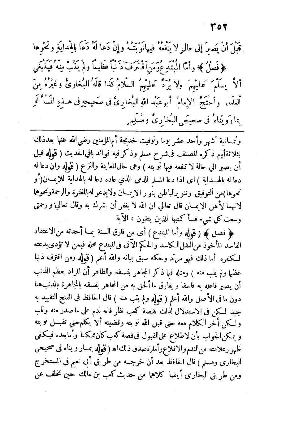فصل: وأما المبتدع ومن اقترف ذنباً عظيماً ولم يتب منه، فينبغي أن لا يسلِّم عليهم، ولا يردَّ عليهم السلام، كذا قاله البخاري وغيره من العلماء: واحتجَّ الإِمام أبو عبد الله البخاري في "صحيحه" في هذه المسألة بما رويناه في "صحيحي البخاري ومسلم"