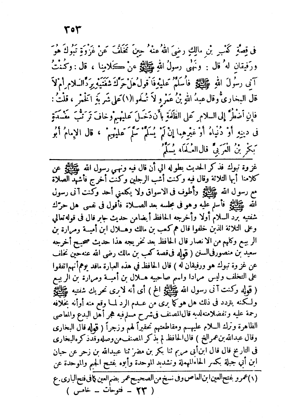 غزوة تبوك هو ورفيقان له) قال الحافظ في هذه العبارة ما في يوهم أنهم اتفقوا على التخلف وليس مراداً واسم صاحبيه هلال بن أمية ومرارة بن الربيع. قوله: (وكنت آتي رسول الله -صلى الله عليه وسلم- الخ) أي أنه لا يرى تحريك شفتيه -صلى الله عليه وسلم- ولكنه يتردد في ذلك هل هو كما يرى مر عدم الرد لما وقع منه أو أنه بخلافه رحمة عليه وتفضلاً منه لديه قال المصنف في شرح مسلم فيه هجر أهل البدع والمعاصي الظاهرة وترك السلام عليهم ومقاطعتهم تحقيراً لهم وزجراً. قوله: (قال البخاري وقال عبد الله بن عمر الخ) قال الحافظ لم يذكر المصنف من وصله وقد ذكره البخاري في التاريخ قال: قال ابن أبي مريم حدثنا بكر بن مضر حدثنا عبيد الله بن زحر عن حبان بن أبي جبلة بكسر الحاء المهملة وتشديد الموحدة وأبوه بفتح الجيم والموحدة عن
