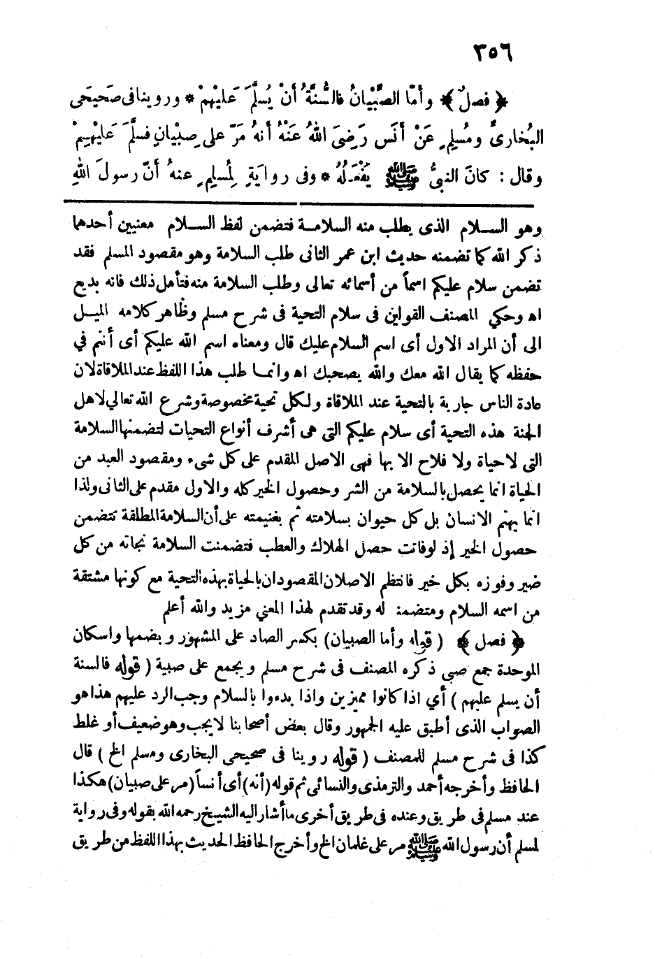 قوله: (وأما الصبيان) بكسر الصاد على المشهور وبضمها وإسكان الموحدة جمع صبي ذكره المصنف في شرح مسلم ويجمع على صبية. قوله: (فالسنة أن يسلم عليهم) أي إذا كانوا مميزين وإذا بدؤوا بالسلام وجب الرد عليهم هذا هو الصواب الذي أطبق عليه الجمهور وقال بعض أصحابنا: لا يجب وهو ضعيف أو غلط كذا في شرح مسلم للمصنف. قوله: (روينا في صحيحي البخاري ومسلم الخ) قال الحافظ وأخرجه أحمد والترمذي والنسائي ثم قوله (أنه) أي أنساً (مر على صبيان) هكذا عند مسلم في طريق وعنده في طريق أخرى ما أشار إليه الشيخ رحمه الله بقوله وفي رواية لمسلم أن رسول الله -صلى الله عليه وسلم- مر على غلمان الخ وأخرج الحافظ الحديث بهذا اللفظ من طريق
