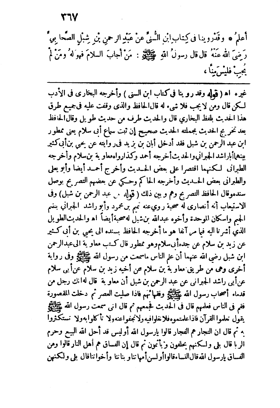 وقد روينا في كتاب ابن السني عن عبد الرحمن بن شبل الصحابي رضي الله عنه قال: قال رسول الله -صلى الله عليه وسلم-: "مَنْ أجابَ السلام فَهُوَ لهُ، ومَنْ لَمْ يُجبْ فَلَيْسَ مِنّا"