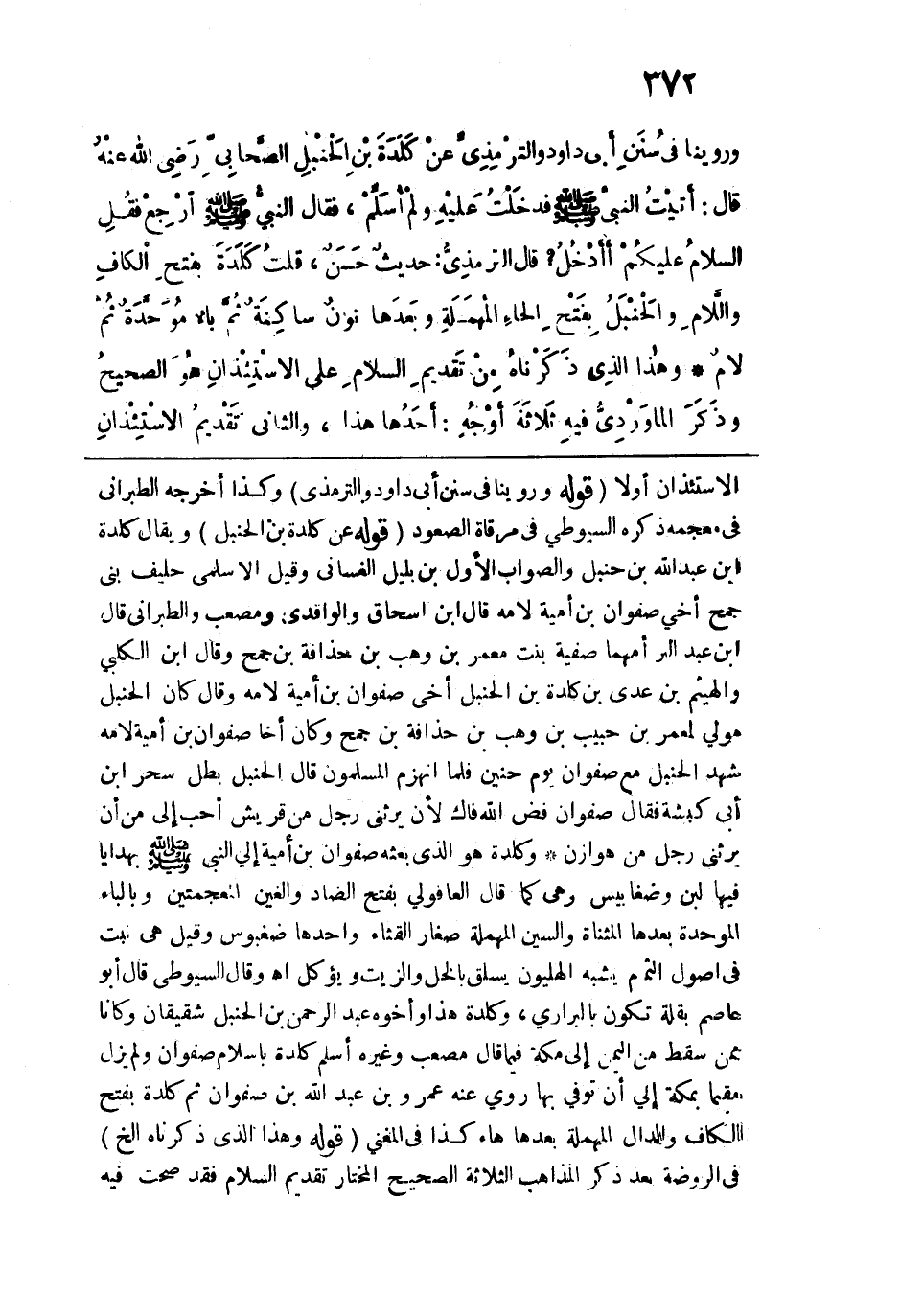 قلت: كَلدَة، بفتح الكاف واللام. والحنبل، بفتح الحاء المهملة وبعدها نون ساكنة ثم باء موحدة مفتوحة ثم لام. وهذا الذي ذكرناه من تقديم السلام على الاستئذان هو الصحيح. وذكر الماوردي فيه ثلاثة أوجه، أحدها هذا، والثاني: تقديم الاستئذان