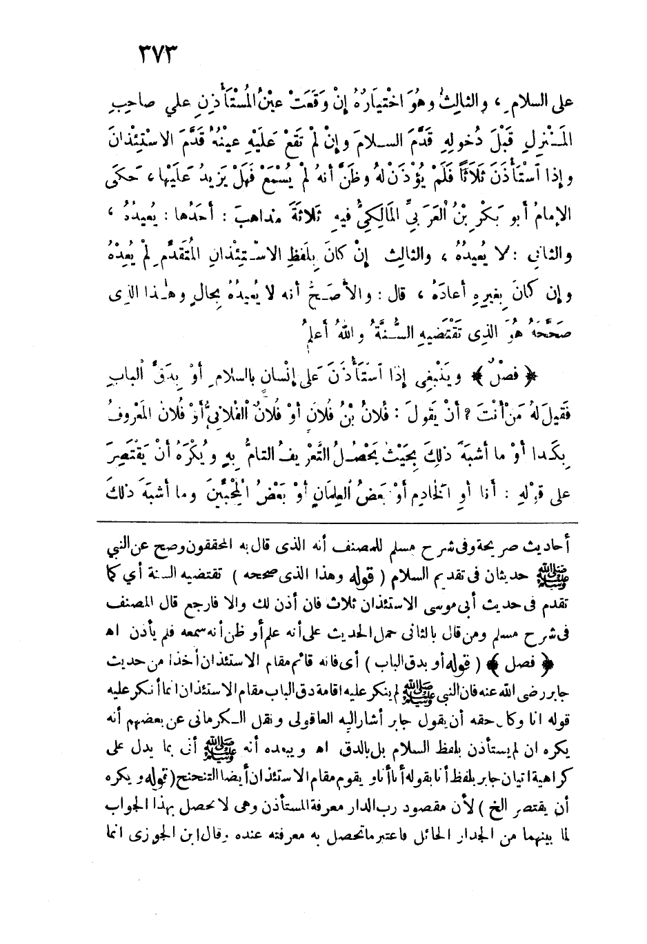 على السلام، والثالث: وهو اختياره: إن وقعت عين المستأذن على صاحب المنزل قبل دخوله قَدَّم السلام، وإن لم تقع عليه عينه، قدَّم الاستئذان. وإذا استأذن ثلاثاً فلم يُؤذَن له وظَنَّ أنه لم يسمع، فهل يزيد عليها؟ حكى الإِمام أبو بكر بن العربي المالكي فيه ثلاثة مذاهب، أحدها: يعيده، والثاني: لا يعيده، والثالث: إن كان بلفظ الاستئذان المتقدِّم لم يُعِدْه، وإن كان بغيره أعاده، قال: والأصح أنه لا يعيده بحال، وهذا الذي صححه هو الذي تقتضيه السُّنَّة، والله أعلم.