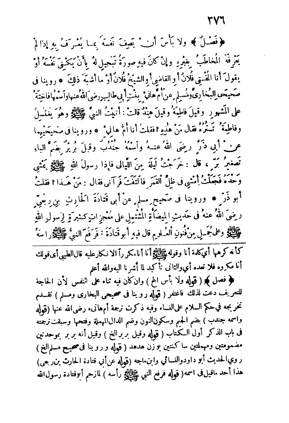 قوله: (روينا في صحيحي البخاري ومسلم) تقدم تخريجه في حكم السلام على النساء وفيه ذكرت ترجمة أم هانيء رضي الله عنها. قوله: (واسمه جندب) بضم الجيم وسكون النون وضم الدال المهملة وفتحها وسبقت ترجمته في باب الذكر أول الكتاب. قوله: (وقيل برير الخ) وقيل: إنه بربر بموحدتين مضمومتين ومهملتين ساكنتين بوزن هدهد. قوله: (وروينا في صحيح مسلم الخ) روى الحديث أبو داود والنسائي وابن ماجه. قوله: (عن أبي قتادة الحارث بن ربعي) هذا أحد ما قيل في اسمه. قوله: (فرفع النبي صلى الله عليه وسلم رأسه) لما زحم أبو قتادة رسول الله