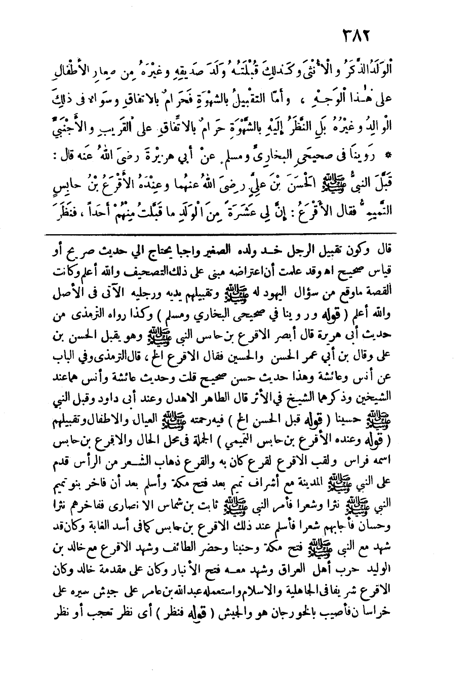 وروينا في "صحيحي البخاري ومسلم" عن أبي هريرة رضي الله عنه قال: "قَبَّلَ النبيُّ -صلى الله عليه وسلم- الحسنَ بن علي رضي الله عنهما وعنده الأقرع بن حابس التميمي، فقال الأقرع: إن لي عشرة من الولد ما قبّلت منهم أحداً، فنظر