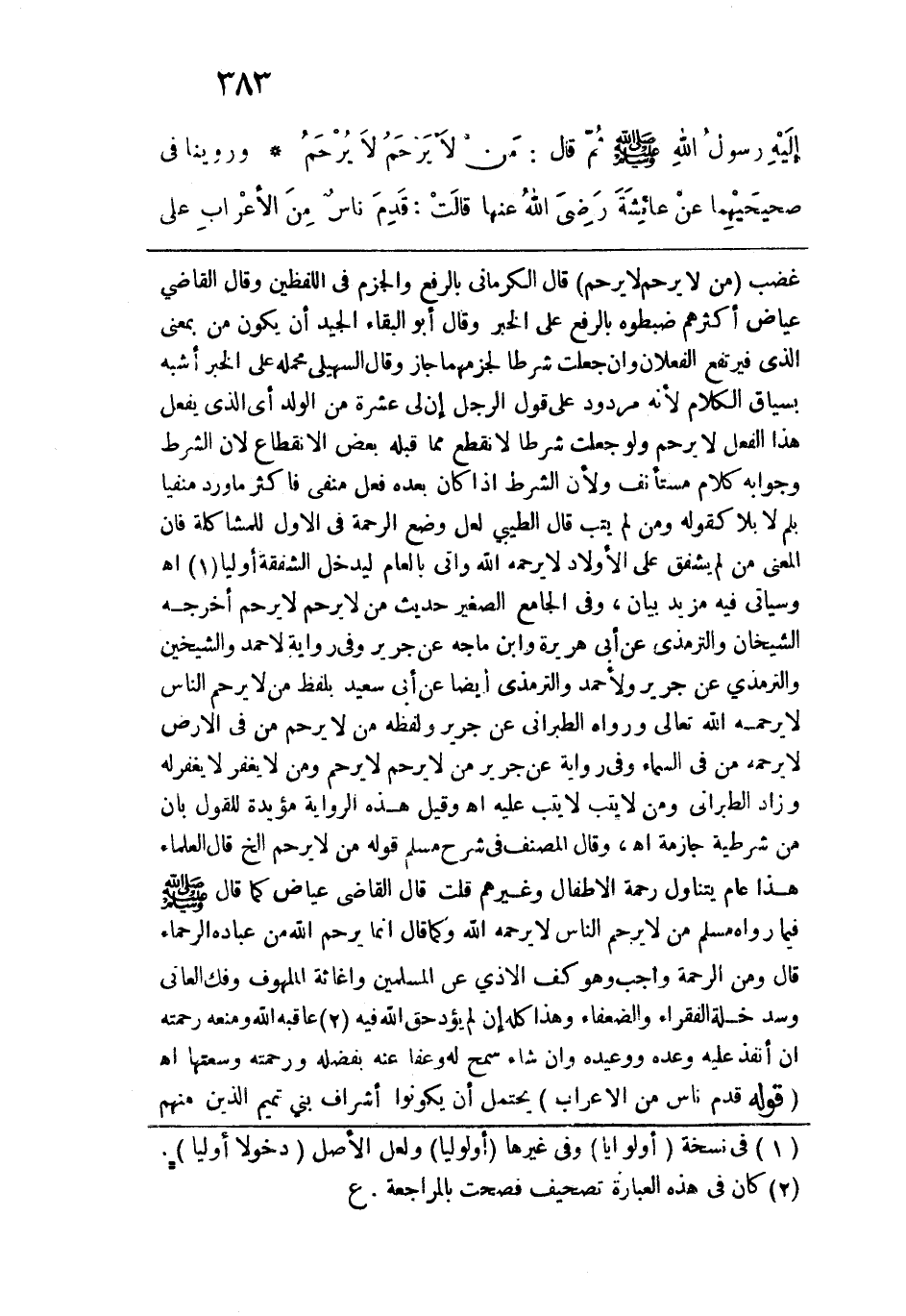 غضب (من لا يَرْحَمُ لا يُرْحَمُ) قال الكرماني بالرفع والجزم في اللفظين وقال القاضي عياض:
