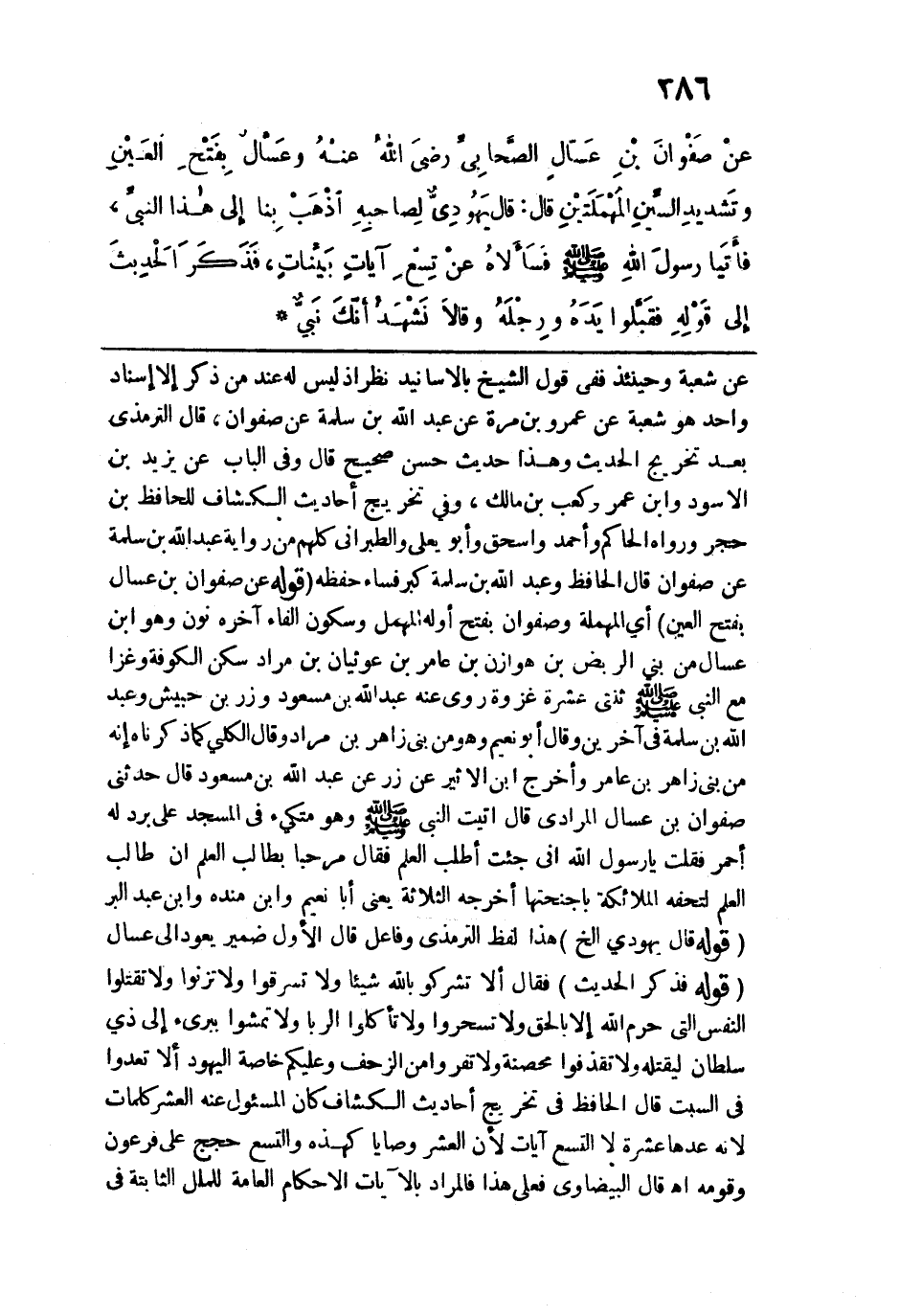 عن شعبة وحينئذٍ ففي قول الشيخ بالأسانيد نظر إذ ليس له عند من ذكر إلا إسناد واحد هو شعبة عن عمرو بن مرة عن عبد الله بن سلمة عن صفوان، قال الترمذي بعد تخريج الحديث وهذا حديث حسن صحيح قال وفي الباب عن يزيد بن الأسود وابن عمر وكعب بن مالك، وفي تخريج أحاديث الكشاف للحافظ ابن حجر ورواه الحاكم وأحمد وإسحاق وأبو يعلى والطبراني كلهم من رواية عبد الله بن سلمة عن صفوان قال الحافظ وعبد الله بن سلمة كبر فساء حفظه. قوله: (عن صفوان بن عسال بفتح العين) أي المهملة وصفوان بفتح أوله المهمل وسكون الفاء آخره نون