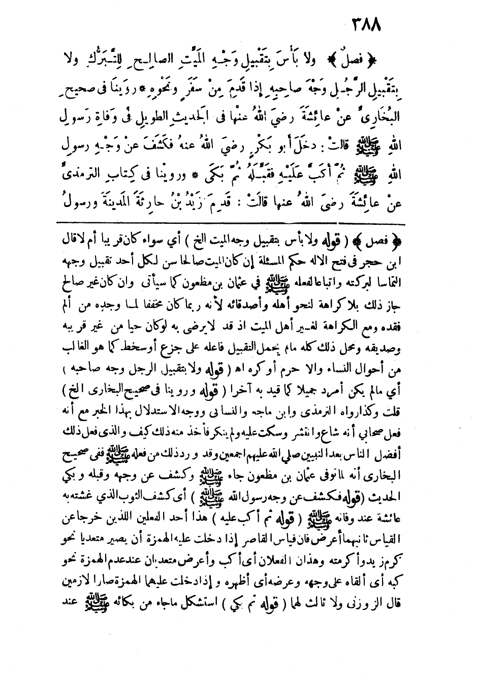 قوله: (ولا بأس بتقبيل وجه الميت الخ) أي سواء كان قريباً أم لا قال ابن حجر في فتح الإله: حكم المسألة إن كان الميت صالحاً سن لكل أحد تقبيل وجهه التماساً لبركته واتباعاً لفعله -صلى الله عليه وسلم- في عثمان بن مظعون كما سيأتي وإن كان غير صالح جاز ذلك بلا كراهة لنحو أهله وأصدقائه لأنه ربما كان مخففاً لما وجده من ألم فقده ومع الكراهة لغير أهل الميت إذ قد لا يرضى به لو كان حياً من غير قريبه وصديقه ومحل ذلك كله ما لم يحمل التقبيل فاعله على جزع أو سخط كما هو الغالب من أحوال النساء وإلا حرم أو كره اهـ. قوله: (ولا بتقبيل الرجل وجه صاحبه) أي ما لم يكن أمرد جميلاً كما قيد به آخراً. قوله: (وروينا في صحيح البخاري الخ) قلت وكذا رواه الترمذي وابن ماجه والنسائي ووجه الاستدلال بهذا الخبر مع أنه فعل صحابي أنه شاع وانتشر وسكت عليه ولم ينكر فأخذ منه ذلك كيف والذي فعل ذلك أفضل النّاس بعد النبيين صلى الله عليهم أجمعين وقد ورد ذلك من فعله -صلى الله عليه وسلم- ففي صحيح البخاري أنه لما توفي عثمان بن مظعون جاء -صلى الله عليه وسلم- وكشف عن وجهه وقبله وبكى الحديث. قوله: (فكشف عن وجه رسول الله -صلى الله عليه وسلم-) أي كشوف الثوب الذي غشته به عائشة عند وفاته -صلى الله عليه وسلم-. قوله: (ثم أكب عليه) هذا أحد الفعلين اللذين خرجا عن القياس ثانيهما أعرض فإن قياس القاصر إذا دخلت عليه الهمزة أن يصير متعدياً نحو كرم زيد وأكرمته وهذان الفعلان أي أكب وأعرض متعديان عند عدم الهمزة نحو كبه أي ألقاه على وجهه وعرضه أكب أظهره وإذا دخلت عليهما الهمزة صارا لازمين قال الزوزني ولا ثالث لهما. قوله: (ثم بكى) استشكل ما جاء من بكائه -صلى الله عليه وسلم- عند