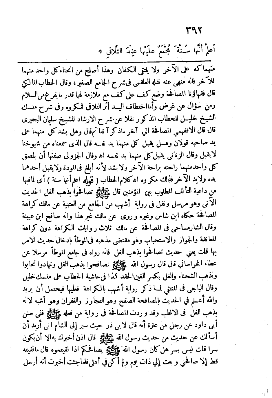 منهما كمه على الآخر ولا يلتقي الكفان وهذا أصلح من انحناء كل واحد منهما للآخر فإنه منهي عنه نقله العلقمي في شرح الجامع الصغير، وقال الحطاب المالكي: قال فقهاؤنا: المصافحة وضع كف على كف مع ملازمة لهما قدر ما يفرغ من السلام ومن سؤال عن غرض وأما اختطاف اليد أثر التلاقي فمكروه وفي شرح منسك الشيخ خليل للحطاب المذكور نقلاً عن شرح الإرشاد للشيخ سليمان البحيري قال: قال الأقفهسي المصافحة إلى آخر ما ذكر آنفاً ثم قال: وهل يشد كل منهما على يد صاحبه قولان وهل يقبل كل منهما يد نفسه قال: الذي سمعناه من شيوخنا لا يقبل وقال الزناتي: يقبل كل منهما يد نفسه اهـ، وقال الجزولي: صفتها أن يلصق كل واحد منهما راحته براحة الآخر ولا يشد لأنه أبلغ في المودة ولا يقبل أحدهما يده ولا يد الآخر فذلك مكروه اهـ، كلام الحطاب. قوله: (أعلم أنها سنة) أي لما فيها من داعية التألف المطلوب بين المؤمنين قال -صلى الله عليه وسلم- تصافحوا يذهب الغل الحديث الآتي وهو مرسل ونقل في رواية أشهب من الجامع من العتبية عن مالك كراهة المصافحة حكاه ابن شاس وغيره وروي عن مالك غير هذا وإنه صافح ابن عيينة وقال الشارمساحي في المصافحة عن مالك ثلاث روايات: الكراهة دون كراهة، المعانقة والجواز والاستحباب وهو مقتضى مذهبه في الموطأ بإدخال حديث الأمر بها قلت: يعني حديث تصافحوا يذهب الغل فإنه رواه في جامع الموطأ مرسلاً عن عطاء الخراساني قال: قال رسول الله -صلى الله عليه وسلم-: "تصافحوا يذهب الغل وتهادوا تحابوا تذهب الشحناء والغل" بكسر الغين الحقد كذا في حاشية الحطاب على منسك خليل وقال الباجي في المنتقى لما ذكر رواية أشهب بالكراهة فعليها فيحتمل أن يريد والله أعلم في الحديث بالمصافحة الصفح وهو التجاوز والغفران وهو أشبه لأنه يذهب الغل في الأغلب وقد وردت المصافحة في رواية من فعله -صلى الله عليه وسلم- ففي سنن أبي داود عن رجل من عترة أنه قال لأبي ذر حيث سير إلى الشام: إني أريد أن أسألك عن حديث من حديث رسول الله -صلى الله عليه وسلم- قال: إذن أخبرك به إلا أن يكون سراً قلت: ليس بسر هل كان رسول الله -صلى الله عليه وسلم- يصافحكم إذا لقيتموه قال: ما لقيته قط إلا صافحني وبعث إليّ ذات يوم ولم أكن في أهلي فلما جئت أخبرت أنه أرسل