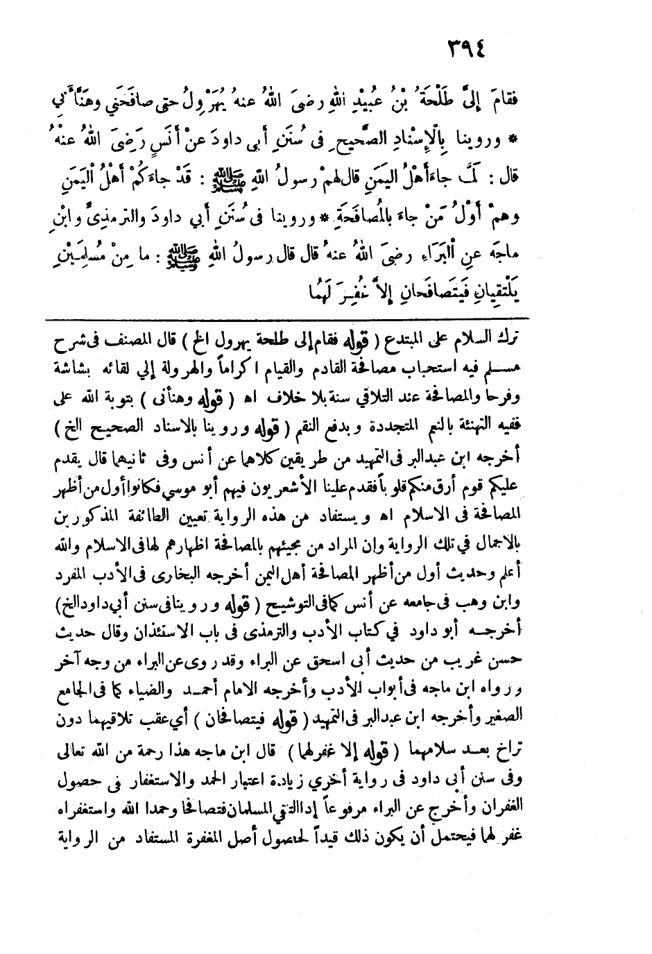 ترك السلام على المبتدع. قوله: (فقام إلى طلحة يهرول الخ) قال المصنف في شرح مسلم فيه استحباب مصافحة القادم والقيام إكراماً والهرولة إلى لقائه بشاشة وفرحاً والمصافحة عند التلاقي سنة بلا خلاف اهـ. قوله: (وهنأني) بتوبة الله علي ففيه التهنئة بالنعم المتجددة وبدفع النقم. قوله: (وروينا بالإسناد الصحيح الخ) أخرجه ابن عبد البر في التمهيد من طريقين كلاهما عن أنس وفي ثانيهما قال: يقدم عليكم قوم أرق منكم قلوباً فقدم علينا الأشعريون فيهم أبو موسى فكانوا أول من أظهر المصافحة في الإسلام اهـ، ويستفاد من هذه الرواية تعيين الطائفة المذكورين بالإجمال في تلك الرواية وإن المراد من مجيئهم بالمصافحة إظهارهم لها في الإسلام والله أعلم وحديث أول من أظهر المصافحة أهل اليمين أخرجه البخاري في الأدب المفرد وابن وهب بني جامعه عن أنس كما في التوشيح. قوله: (وروينا في سنن أبي داود الخ) أخرجه أبو داود في كتاب الأدب والترمذي في باب الاستئذان وقال حديث حسن غريب من حديث أبي إسحاق عن البراء وفي روي عن البراء من وجه آخر ورواه ابن ماجه وفي أبواب الأدب وأخرجه الإِمام أحمد والضياء كما في الجامع الصغير وأخرجه ابن عبد البر في التمهيد. قوله: (فيتصافحان) أي عقب تلاقيهما دون تراخ بعد سلامهما. قوله: (إلا غفر لهما) قال ابن ماجه: هذا رحمة من الله تعالى وفي سنن أبي داود في رواية أخرى