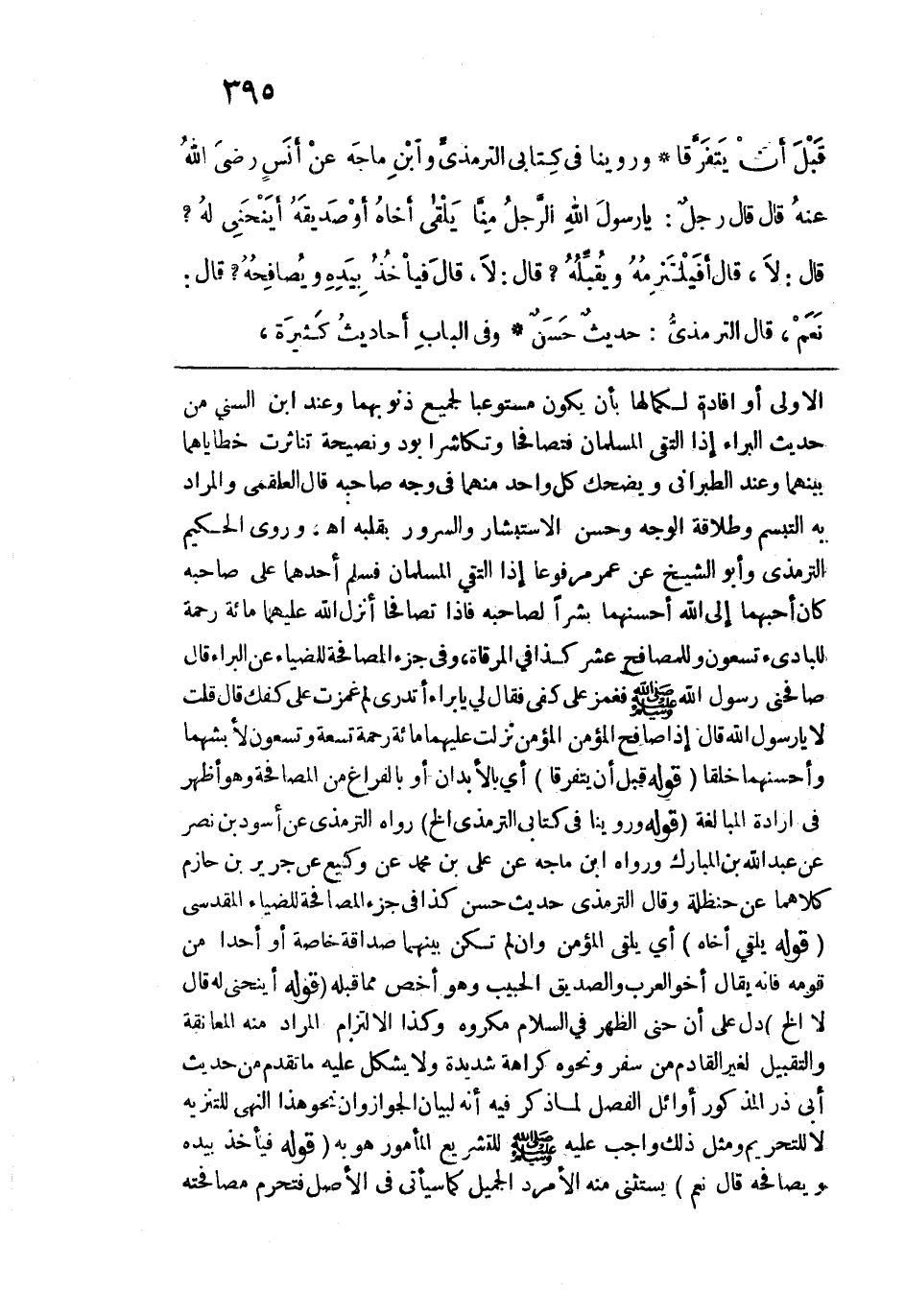 مائة رحمة للبادئ تسعون وللمصافح عشر كذا في المرقاة، وفي جزء المصافحة للضياء عن البراء قال: صافحني رسول الله -صلى الله عليه وسلم- فغمز على كفي فقال لي: "يا براء أتدري لم غمزت على كفك" قال: قلت: لا يا رسول الله قال: "إذا صافح المؤمن المؤمن نزلت عليهما مائة رحمة تسعة وتسعون لأبشهما وأحسنهما خلقاً". قوله: (قبل أن يتفرقا) أي بالأبدان أو بالفراغ من المصافحة وهو أظهر في إرادة المبالغة. قوله: (وروينا في كتاب الترمذي الخ) رواه الترمذي عن أسود بن نصر عن عبد الله بن المبارك ورواه ابن ماجه عن علي بن محمد عن وكيع عن جرير بن حازم كلاهما عن حنظلة وقال الترمذي: حديث حسن كذا في جزء المصافحة للضياء المقدسي. قوله: (يلقى أخاه) أي يلقى المؤمن وإن لم تكن بينهما صداقة خاصة أو أحداً من قومه فإنه يقال: أخو العرب والصديق الحبيب وهو أخص مما قبله. قوله: (أينحني له قال: لا الخ) دل على أن حني الظهر في السلام مكروه وكذا الالتزام المراد منه المعانقة والتقبيل لغير القادم من سفر ونحوه كراهة شديدة ولا يشكل عليه ما تقدم من حديث أبي ذر المذكور أوائل الفصل لما ذكر فيه أنه لبيان الجواز وإن نحو هذا النهي للتنزيه لا للتحريم ومثل ذلك واجب عليه -صلى الله عليه وسلم- للتشريع المأمور هو به. قوله: (فيأخذ بيده ويصافحه قال: نعم) يستثنى منه الأمرد الجميل كما سيأتي في الأصل فتحرم مصافحته