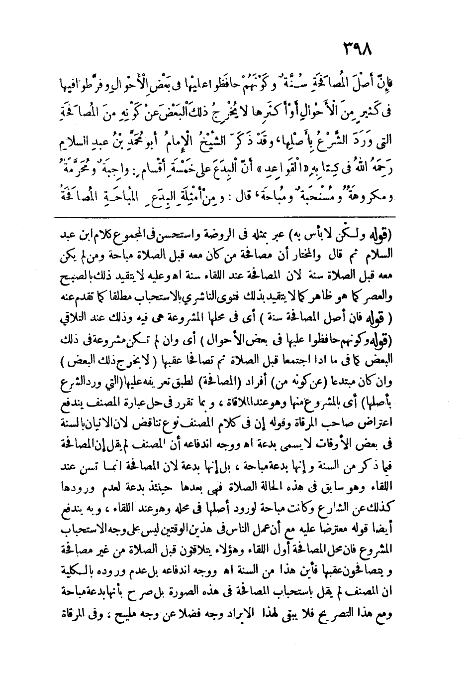 قوله: (ولكن لا بأس به) عبر بمثله في الروضة واستحسن في المجموع كلام ابن عبد السلام ثم قال والمختار أن مصافحة من كان معه قبل الصلاة مباحة ومن لم يكن معه قبل الصلاة سنة لأن المصافحة عند اللقاء سنة اهـ، وعليه لا يتقيد ذلك بالصبح والعصر كما هو ظاهر كما لا يتقيد بذلك فتوى الناشري بالاستحباب مطلقاً كما تقدم عنه. قوله: (فإن أصل المصافحة سنة) أي في محلها المشروعة هي فيه وذلك عند التلاقي. قوله: (وكونهم حافظوا عليها في بعض الأحوال) أي وإن لي تكن مشروعة في ذلك البعض كما في ما إذا اجتمعا قبل الصلاة ثم تصافحا عقبها (لا يخرج ذلك البعض) وإن كان مبتدعاً (عن كونه من) أفراد (المصافحة) لطبق تعريفه عليها (التي ورد الشرع بأصلها) أي بالمشروع منها وهو عند الملاقاة، وبما تقرر في حل عبارة المصنف يندفع اعتراض صاحب المرقاة وقوله إن في كلام المصنف نوع تناقض لأن الإتيان بالسنة في بعض الأوقات لا يسمى بدعة اهـ ووجه اندفاعه أن المصنف لم يقل إن المصافحة فيما ذكر من السنة وإنها بدعة مباحة، بل إنها بدعة لأن المصافحة إنما تسن عند اللقاء وهو سابق في هذه الحالة الصلاة فهي بعدها حينئذٍ بدعة لعدم ورودها كذلك عن الشارع وكانت مباحة لورود أصلها في محله وهو عند اللقاء، وبه يندفع أيضاً قوله معترضاً عليه مع أن عمل النّاس في هذين الوقتين ليس على وجه الاستحباب المشروع فإن محل المصافحة أول اللقاء وهؤلاء يتلاقون قبل الصلاة من غير مصافحة ويتصافحون عقبها فأين هذا من السنة اهـ، ووجه اندفاعه بل عدم وروده بالكلية أن المصنف لم يقل باستحباب المصافحة في هذه الصورة بل صرح بأنها بدعة مباحة ومع هذا التصريح فلا يبقى لهذا الإيراد وجه فضلاً عن وجه مليح، وفي المرقاة