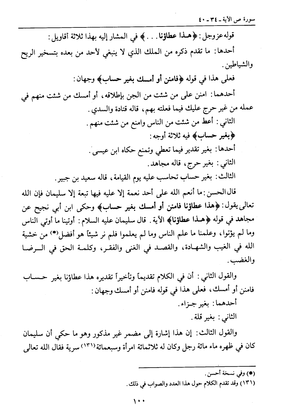 قوله عز وجل: {هذا عطاؤنا ... } في المشار إليه بهذا ثلاثة أقاويل: أحدها: ما تقدم ذكره من الملك الذي لا ينبغي لأحد من بعده بتسخير الريح والشياطين. فعلى هذا في قوله {فامنن أو أمسك بغير حساب} وجهان: أحدهما: امنن على من شئت من الجن بإطلاقه , أو امسك من شئت منهم في عمله من غير حرج عليك فيما فعلته بهم , قاله قتادة والسدي. الثاني: اعط من شئت من الناس وامنع من شئت منهم. {بغير حساب} فيه ثلاثة أوجه: أحدها: بغير تقدير فيما تعطي وتمنع حكاه ابن عيسى. الثاني: بغير حرج , قاله مجاهد. الثالث: بغير حساب تحاسب عليه يوم القيامة , قاله سعيد بن جبير. قال الحسن: ما أنعم الله على أحد نعمة إلا عليه فيها تبعة إلا سليمان فإن الله تعالى يقول: {هذا عطاؤنا فامنن أو أمسك بغير حساب} وحكى ابن أبي نجيح عن مجاهد في قوله {هذا عطاؤنا} الآية. قال سليمان عليه السلام: أوتينا ما أوتي الناس وما لم يؤتوا، وعلمنا ما علم الناس وما لم يعلموا فلم نر شيئاً هو أفضل من خشية الله في الغيب والشهادة، والقصد في الغنى والفقر , وكلمة الحق في الرضا والغضب. والقول الثاني: أن في الكلام تقديماً وتأخيراً تقديره هذا عطاؤنا بغير حساب فامنن أو أمسك، فعلى هذا في قوله فامنن أو أمسك وجهان: أحدهما: بغير جزاء. الثاني: بغير قلة. والقول الثالث: إن هذا إشارة إلى مضمر غير مذكور وهو ما حكي أن سليمان كان في ظهره ماء مائة رجل وكان له ثلاثمائة امرأته وسبعمائة سرية فقال الله تعالى