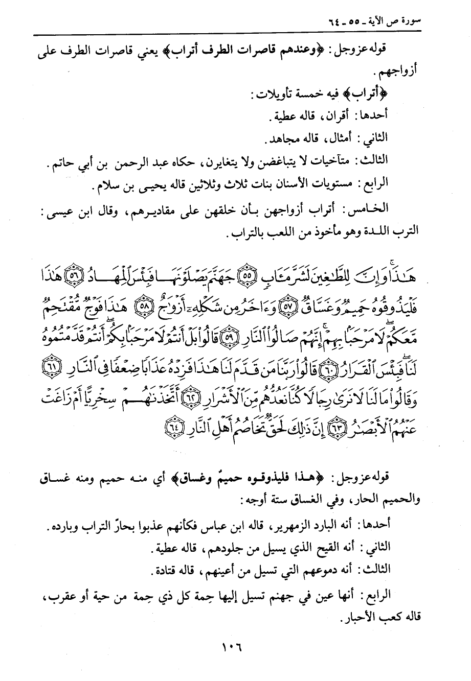 {هذا وإن للطاغين لشر مآب جهنم يصلونها فبئس المهاد هذا فليذوقوه حميم وغساق وآخر من شكله أزواج هذا فوج مقتحم معكم لا مرحبا بهم إنهم صالوا النار قالوا بل أنتم لا مرحبا بكم أنتم قدمتموه لنا فبئس القرار قالوا ربنا من قدم لنا هذا فزده عذابا ضعفا في النار وقالوا ما لنا لا نرى رجالا كنا نعدهم من الأشرار أتخذناهم سخريا أم زاغت عنهم الأبصار إن ذلك لحق تخاصم أهل النار} قوله عز وجل: {هذا فليذوقوه حميمٌ وغساق} أي منه حميم ومنه غساق والحميم الحار , وفي الغساق ستة أوجه: أحدها: أنه البارد الزمهرير , قاله ابن عباس فكأنهم عذبوا بحارّ التراب وبارده. الثاني: أنه القيح الذي يسيل من جلودهم، قاله عطية. الثالث: أنه دموعهم التي تسيل من أعينهم، قاله قتادة. الرابع: أنها عين في جهنم تسيل إليها حِمة كل ذي حِمة من حية أو عقرب، قاله كعب الأحبار.