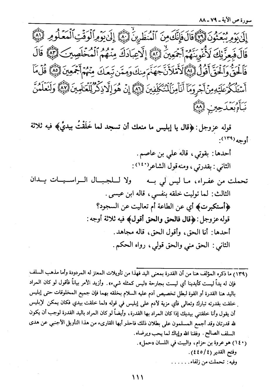 إلى يوم يبعثون قال فإنك من المنظرين إلى يوم الوقت المعلوم قال فبعزتك لأغوينهم أجمعين إلا عبادك منهم المخلصين قال فالحق والحق أقول لأملأن جهنم منك وممن تبعك منهم أجمعين قل ما أسألكم عليه من أجر وما أنا من المتكلفين إن هو إلا ذكر للعالمين ولتعلمن نبأه بعد حين} قوله عز وجل: {قال يا إبليس ما منعك أن تسجد لما خَلَقْتُ بيديَّ} فيه ثلاثة أوجه: أحدها: بقوتي، قاله علي بن عاصم. الثاني: بقدرتي، ومنه قول الشاعر: