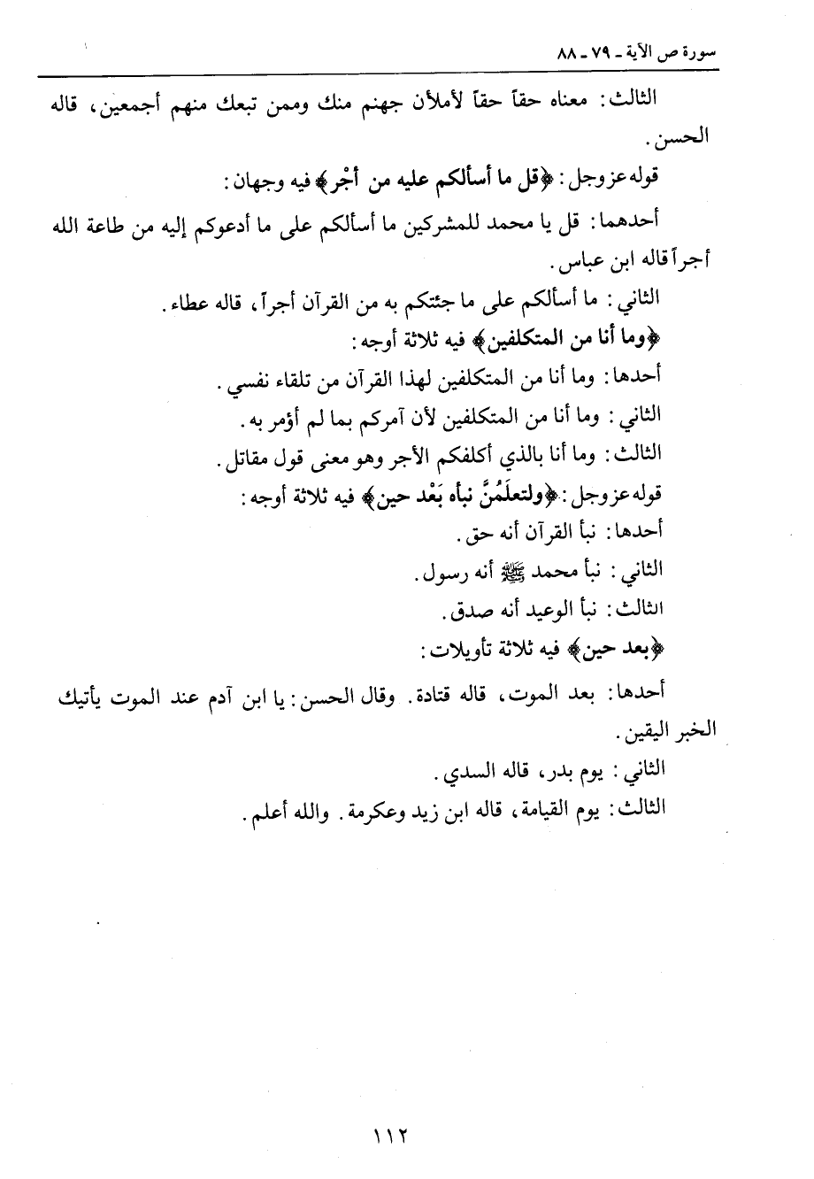 الثالث: معناه حقاً لأملأن جهنم منك ومن تبعك منهم أجمعين , قاله الحسن. قوله عز وجل: {قل ما أسألكم عليه من أجْر} فيه وجهان: أحدهما: قل يا محمد للمشركين ما أسألكم على ما أدعوكم إليه من طاعة الله أجراً قاله ابن عباس. الثاني: ما أسألكم على ما جئتكم به من القرآن أجراً , قاله عطاء. {وما أنا من المتكلفين} فيه ثلاثة أوجه: أحدها: وما أنا من المتكلفين لهذا القرآن من تلقاء نفسي. الثاني: وما أنا من المتكلفين لأن آمركم بما لم أؤمر به. الثالث: وما أنا بالذي أكلفكم الأجر وهو معنى قول مقاتل. قوله عز وجل: {ولتعلَمُنَّ نبأه بَعْد حين} فيه ثلاثة أوجه: أحدها: نبأ القرآن أنه حق. الثاني: نبأ محمد صلى الله عليه وسلم أنه رسول. الثالث: نبأ الوعيد أنه صدق. {بعد حين} فيه ثلاثة تأويلات: أحدها: بعد الموت , قاله قتادة. وقال الحسن: يا ابن آدم عند الموت يأتيك الخبر اليقين. الثاني: يوم بدر , قاله السدي. الثالث: يوم القيامة , قاله ابن زيد وعكرمة، والله أعلم.