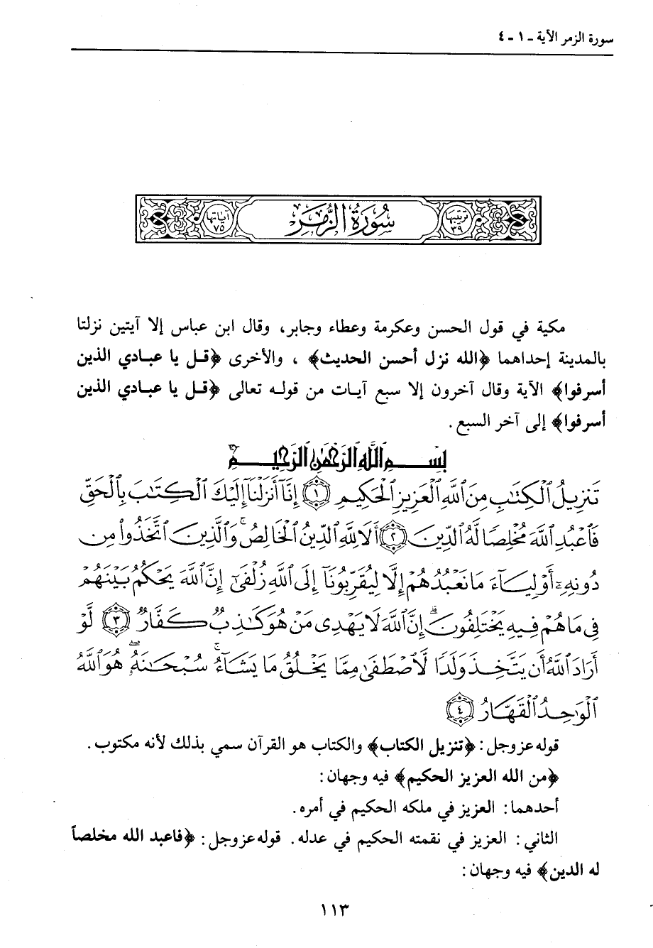 {تنزيل الكتاب من الله العزيز الحكيم إنا أنزلنا إليك الكتاب بالحق فاعبد الله مخلصا له الدين ألا لله الدين الخالص والذين اتخذوا من دونه أولياء ما نعبدهم إلا ليقربونا إلى الله زلفى إن الله يحكم بينهم فيما هم فيه يختلفون إن الله لا يهدي من هو كاذب كفار لو أراد الله أن يتخذ ولدا لاصطفى مما يخلق ما يشاء سبحانه هو الله الواحد القهار} قوله عز وجل: {تنزيل الكتاب} والكتاب هو القرآن سمي بذلك لأنه مكتوب. {من الله العزيز الحكيم} فيه وجهان: أحدهما: العزيز في ملكه الحكيم في أمره. الثاني: العزيز في نقمته الحكيم في عدله. قوله عز وجل: {فاعبد الله مخلصاً له الدين} فيه وجهان: