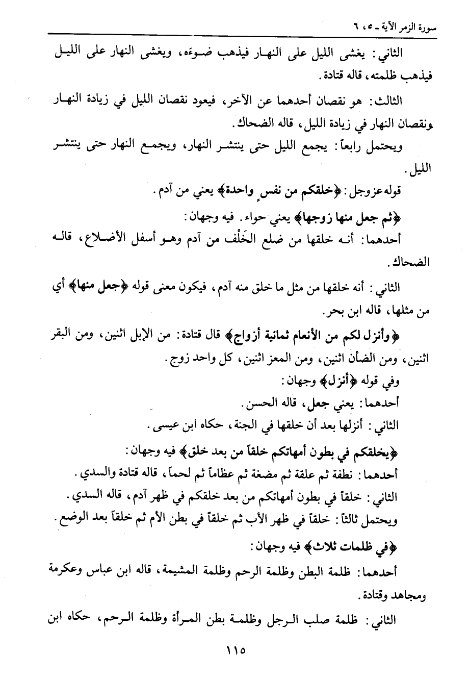 الثاني: يغشى الليل على النهار فيذهب ضوءه، ويغشى النهارعلى الليل فيذهب ظلمته، قاله قتادة. الثالث: هو نقصان أحدهما عن الآخر، فيعود نقصان الليل في زيادة النهار ونقصان النهار في زيادة الليل، قاله الضحاك. ويحتمل رابعاً: يجمع الليل حتى ينتشر النهار، ويجمع النهار حتى ينتشر الليل. قوله عز وجل: {خلقكم من نفسٍ واحدة} يعني من آدم. {ثم جعل منها زوجها} يعني حواء. فيه وجهان: أحدهما: أنه خلقها من ضلع الخَلْف من آدم وهو أسفل الأضلاع , قاله الضحاك. الثاني: أنه خلقها من مثل ما خلق منه آدم , فيكون معنى قوله {جعل منها} أي من مثلها , قاله ابن بحر. {وأنزل لكم من الأنعام ثمانية أزواج} قال قتادة: من الإبل اثنين , ومن البقر اثنين , ومن الضأن اثنين , ومن المعز اثنين , كل واحد زوج. وفي قوله {أنزل} وجهان: أحدهما: يعني جعل , قاله الحسن. الثاني: أنزلها بعد أن خلقها في الجنة , حكاه ابن عيسى. {يخلقكم في بطون أمهاتكم خلقاً من بعد خلق} فيه وجهان: أحدهما: نطفة ثم علقة ثم مضغة ثم عظاماً ثم لحماً , قاله قتادة والسدي. الثاني: خلقاً في بطون أمهاتكم من بعد خلقكم في ظهرآدم , قاله السدي. ويحتمل ثالثاً: خلقاً في ظهر الأب ثم خلقاً في بطن الأم ثم خلقاً بعد الوضع. {في ظلمات ثلاث} فيه وجهان: أحدهما: ظلمة البطن وظلمة الرحم وظلمة المشيمة، قاله ابن عباس وعكرمة ومجاهد وقتادة. الثاني: ظلمة صلب الرجل وظلمة بطن المرأة وظلمة الرحم، حكاه ابن