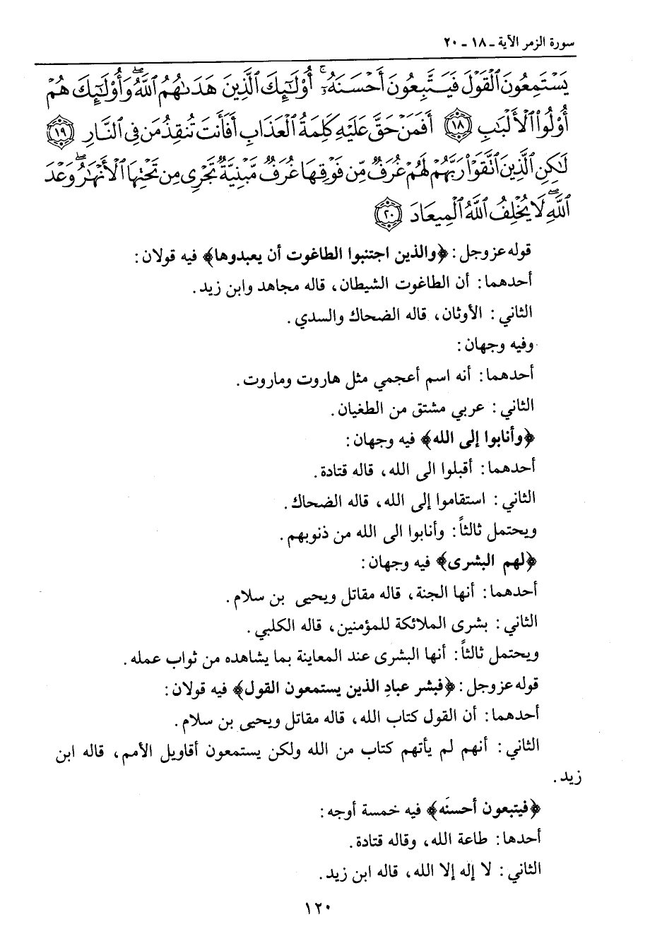 يستمعون القول فيتبعون أحسنه أولئك الذين هداهم الله وأولئك هم أولوا الألباب أفمن حق عليه كلمة العذاب أفأنت تنقذ من في النار لكن الذين اتقوا ربهم لهم غرف من فوقها غرف مبنية تجري من تحتها الأنهار وعد الله لا يخلف الله الميعاد} قوله عز وجل: {والذين اجتنبوا الطاغوت أن يعبدوها} فيه قولان: أحدهما: أن الطاغوت الشيطان , قاله مجاهد وابن زيد. الثاني: الأوثان , قاله الضحاك والسدي. وفيه وجهان: أحدهما: أنه اسم أعجمي مثل هاروت وماروت. الثاني: عربي مشتق من الطغيان. {وأنابوا إلى الله} فيه وجهان: أحدهما: أقبلوا إلى الله , قاله قتادة. الثاني: استقاموا إلى الله , قاله الضحاك. ويحتمل ثالثاً: وأنابوا إلى الله من ذنوبهم. {لهم البشرى} فيه وجهان: أحدهما: أنها الجنة , قاله مقاتل ويحيى بن سلام. الثاني: بشرى الملائكة للمؤمنين , قاله الكلبي. ويحتمل ثالثاً: أنها البشرى عند المعاينة بما يشاهده من ثواب عمله. قوله عز وجل: {فبشر عبادِ الذين يستمعون القول} فيه قولان: أحدهما: أن القول كتاب الله , قاله مقاتل ويحيى بن سلام. الثاني: أنهم لم يأتهم كتاب من الله ولكن يستمعون أقاويل الأمم , قاله ابن زيد. {فيتبعون أحسنَه} فيه خمسة أوجه: أحدها: طاعة الله , قاله قتادة. الثاني: لا إله إلا الله، قاله ابن زيد.