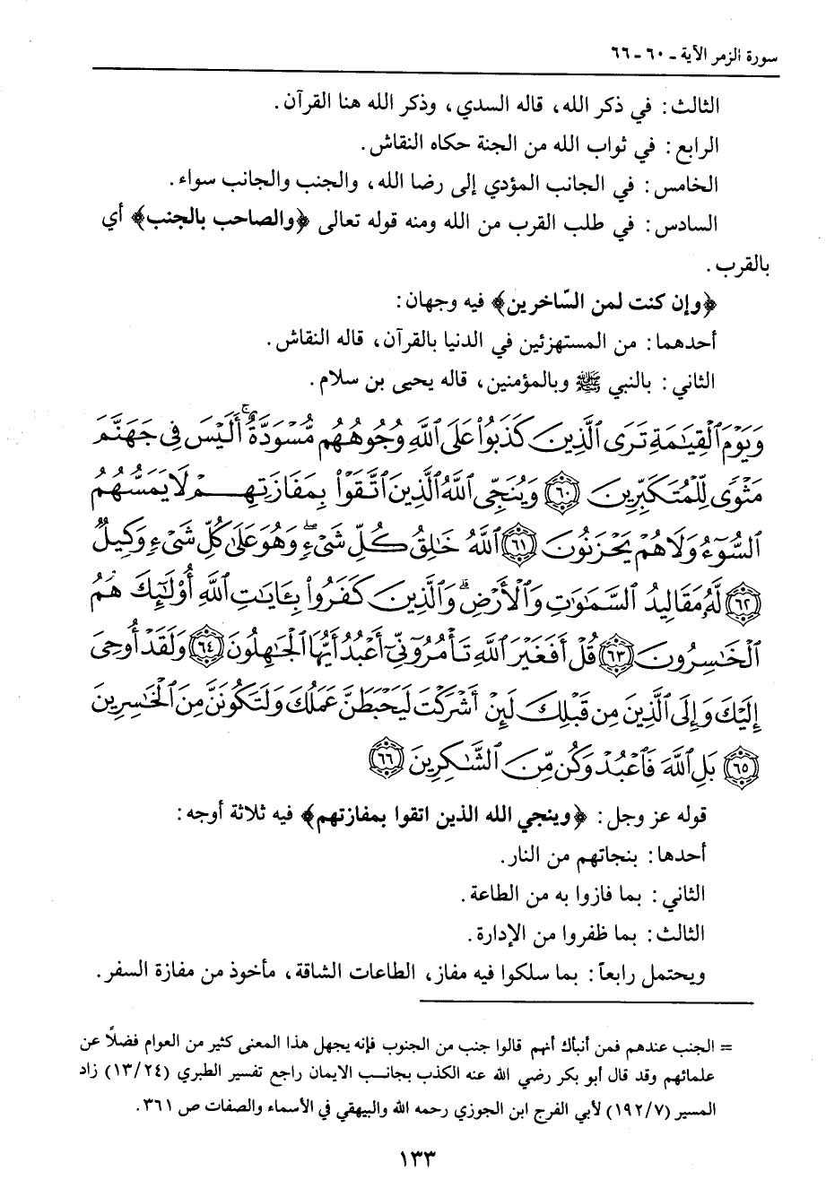 {ويوم القيامة ترى الذين كذبوا على الله وجوههم مسودة أليس في جهنم مثوى للمتكبرين وينجي الله الذين اتقوا بمفازتهم لا يمسهم السوء ولا هم يحزنون الله خالق كل شيء وهو على كل شيء وكيل له مقاليد السماوات والأرض والذين كفروا بآيات الله أولئك هم الخاسرون قل أفغير الله تأمروني أعبد أيها الجاهلون ولقد أوحي إليك وإلى الذين من قبلك لئن أشركت ليحبطن عملك ولتكونن من الخاسرين بل الله فاعبد وكن من الشاكرين} قوله عز وجل: {وينجي الله الذين اتقوا بمفازتهم} فيه ثلاثة أوجه: أحدها: بنجاتهم من النار. الثاني: بما فازوا به من الطاعة. الثالث: بما ظفروا من الإدارة. ويحتمل رابعاً: بما سلكوا فيه مفاز , الطاعات الشاقة , مأخوذ من مفازة السفر.