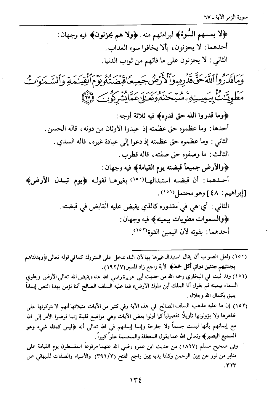 {وما قدروا الله حق قدره والأرض جميعا قبضته يوم القيامة والسماوات مطويات بيمينه سبحانه وتعالى عما يشركون} {وما قدروا الله حق قدرِه} فيه ثلاثة أوجه: أحدها: وما عظموه حق عظمته إذ عبدوا الأوثان من دونه , قاله الحسن. الثاني: وما عظموه حق عظمته إذ دعوا إلى عبادة غيره , قاله السدي. الثالث: ما وصفوه حق صفته , قاله قطرب. {والأرض جميعاً قبضته يوم القيامة} فيه وجهان: أحدهما: أن قبضه استبدالها بغيرها لقوله {يوم تبدل الأرض} [إبراهيم: 48] وهو محتمل. الثاني: أي هي في مقدوره كالذي يقبض عليه القابض في قبضته. {والسموات مطويات بيمينه} فيه وجهان: أحدهما: بقوته لأن اليمين القوة.