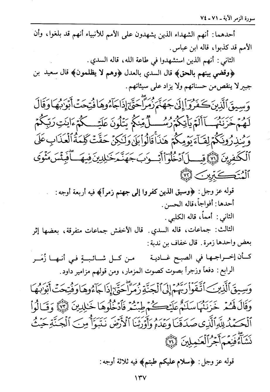 {وسيق الذين كفروا إلى جهنم زمرا حتى إذا جاؤوها فتحت أبوابها وقال لهم خزنتها ألم يأتكم رسل منكم يتلون عليكم آيات ربكم وينذرونكم لقاء يومكم هذا قالوا بلى ولكن حقت كلمة العذاب على الكافرين قيل ادخلوا أبواب جهنم خالدين فيها فبئس مثوى المتكبرين} قوله عز وجل: {وسيق الذين كفروا إلى جهنم زمراً} فيه أربعة أوجه: أحدها: أفواجاً , قاله الحسن. الثاني: أمماً , قاله الكلبي. الثالث: جماعات , قاله السدي. قال الأخفش جماعات متفرقة , بعضها إثر بعض واحدها زمرة. قال خفاف بن ندبة: