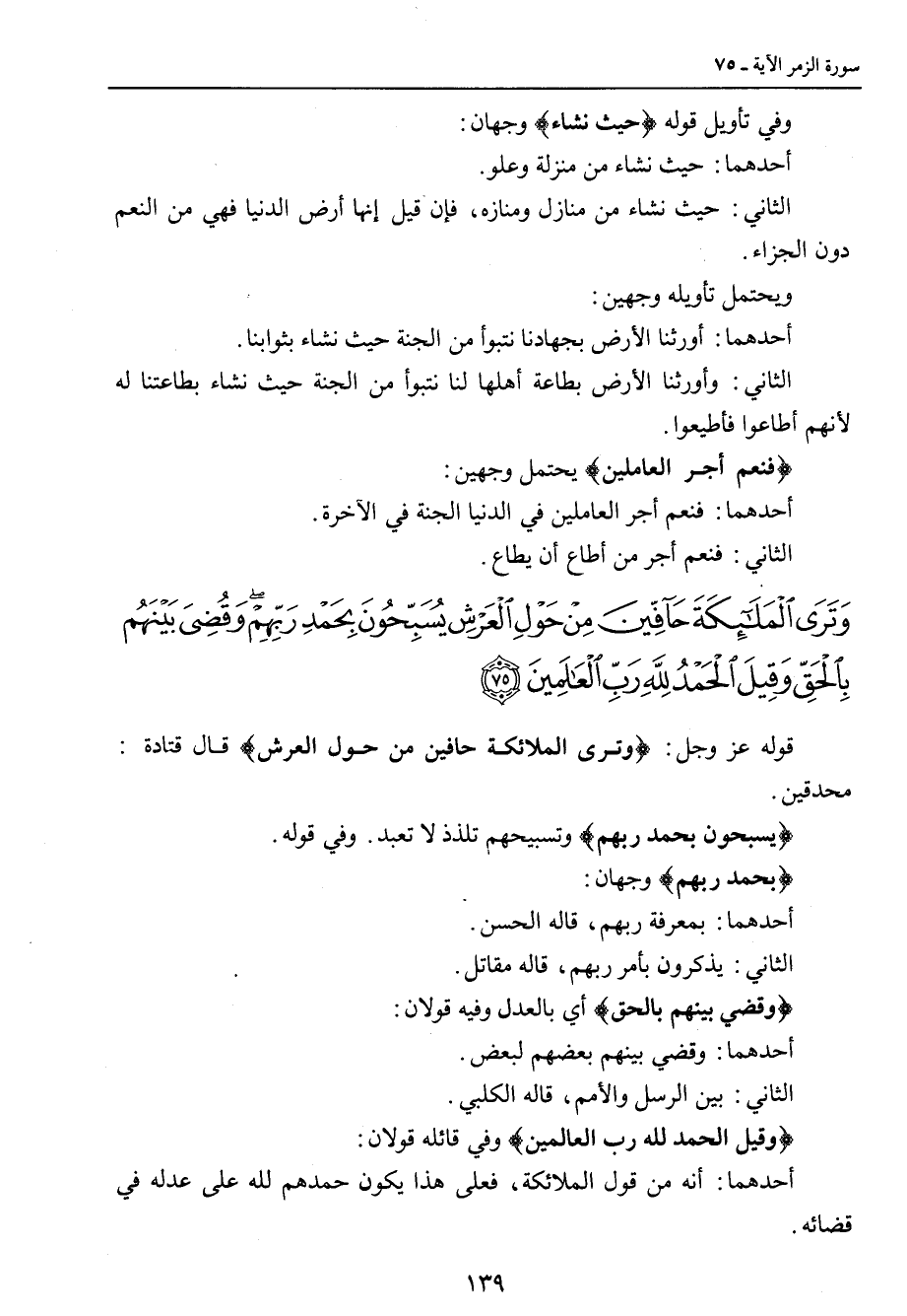 وفي تأويل قوله {حيث نشاء} وجهان: أحدهما: حيث نشاء من منزلة وعلو. الثاني: حيث نشاء من منازل ومنازه , فإن قيل إنها أرض الدنيا فهي من النعم دون الجزاء. ويحتمل تأويله وجهين: أحدهما: أورثنا الأرض بجهادنا نتبوأ من الجنة حيث نشاء بثوابنا. الثاني: وأورثنا الأرض بطاعة أهلها لنا نتبوأ من الجنة حيث نشاء بطاعتنا له لأنهم أطاعوا فأطيعوا. {فنعم أجر العاملين} يحتمل وجهين: أحدهما: فنعم أجر العاملين في الدنيا الجنة في الآخرة. الثاني: فنعم أجر من أطاع أن يطاع. {وترى الملائكة حافين من حول العرش يسبحون بحمد ربهم وقضى بينهم بالحق وقيل الحمد لله رب العالمين}. قوله عز وجل: {وترى الملائكة حافين من حول العرش} قال قتادة: محدقين. {يسبحون بحمد ربهم} وتسبيحهم تلذذ لا تعبد. وفي قوله. {بحمد ربهم} وجهان: أحدهما: بمعرفة ربهم، قاله الحسن. الثاني: يذكرون بأمر ربهم، قاله مقاتل. {وقضى بينهم بالحق} أي بالعدل وفيه قولان: أحدهما: وقضي بينهم بعضهم لبعض. الثاني: بين الرسل والأمم، قاله الكلبي. {وقيل الحمد لله رب العالمين} وفي قائله قولان: أحدهما: أنه من قول الملائكة، فعلى هذا يكون حمدهم لله على عدله في قضائه.