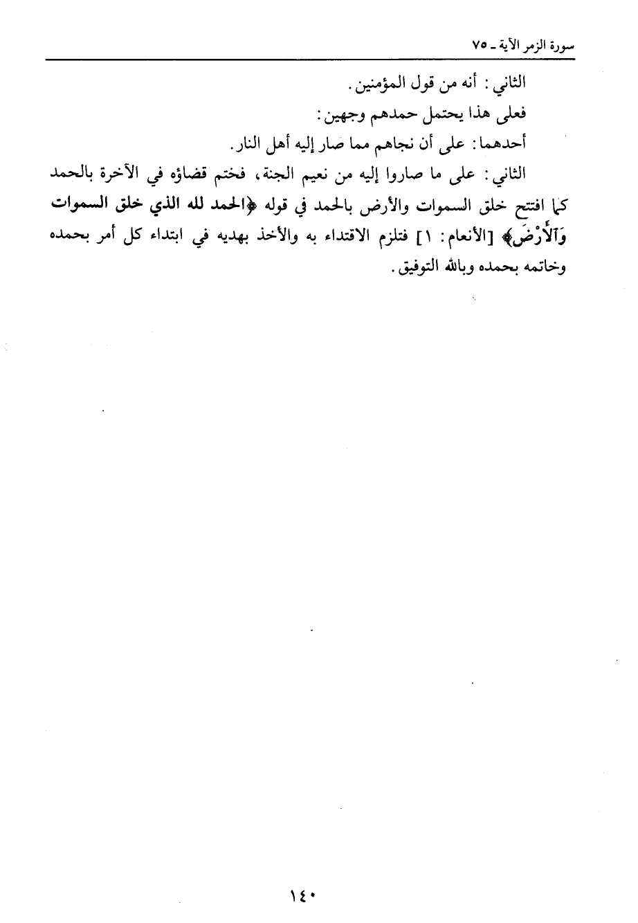 الثاني: أنه من قول المؤمنين. فعلى هذا يحتمل حمدهم وجهين: أحدهما: على أن نجاهم مما صار إليه أهل النار. الثاني: على ما صاروا إليه من نعيم الجنة، فختم قضاؤه في الآخرة بالحمد كما افتتح خلق السموات والأرض بالحمد في قوله {الحمد لله الذي خلق السموات والأرض} [الأنعام: 1] فتلزم الاقتداء به والأخذ بهديه في ابتداء كل أمر بحمده وخاتمه بحمده وبالله التوفيق.