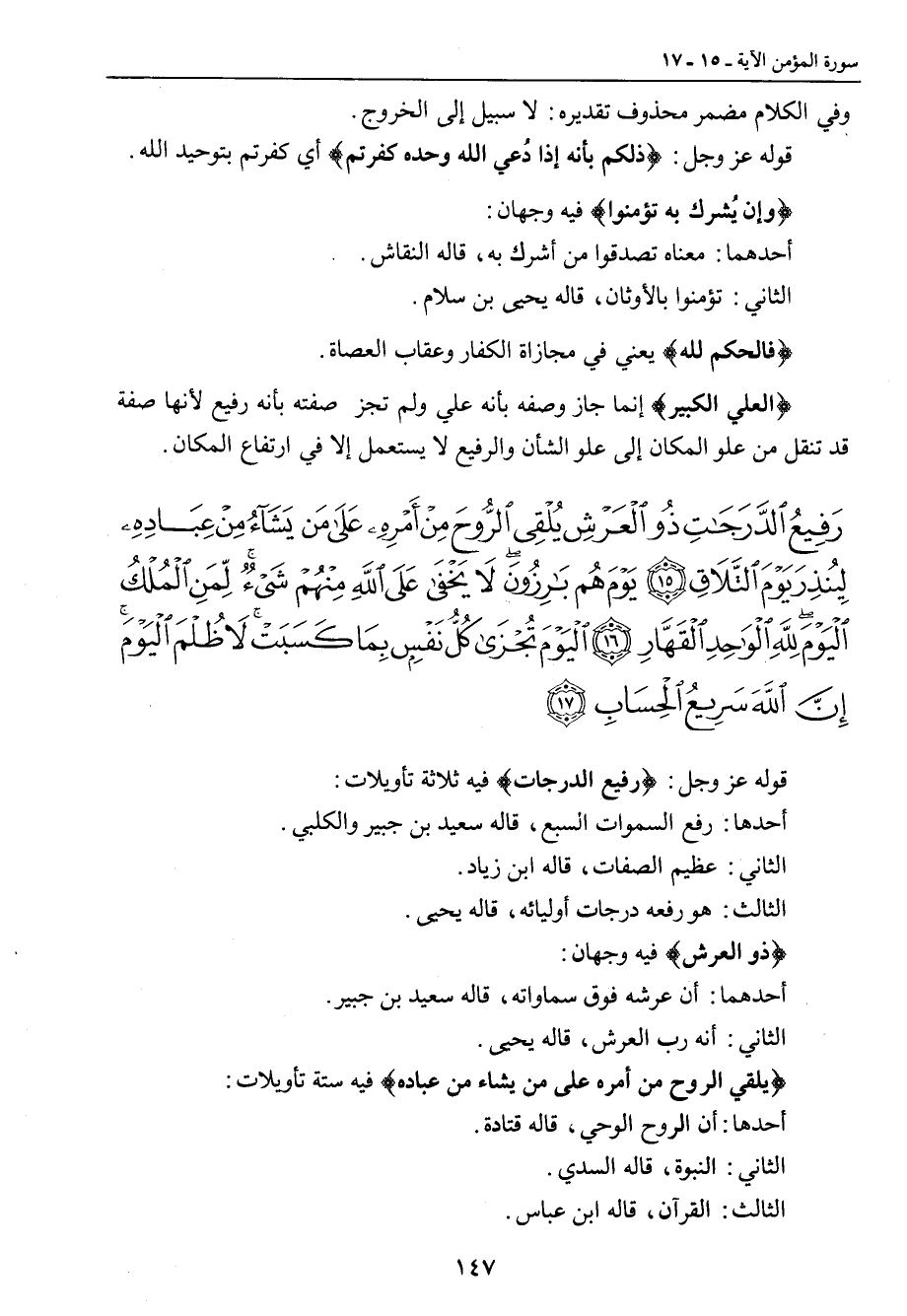 {رفيع الدرجات ذو العرش يلقي الروح من أمره على من يشاء من عباده لينذر يوم التلاق يوم هم بارزون لا يخفى على الله منهم شيء لمن الملك اليوم لله الواحد القهار اليوم تجزى كل نفس بما كسبت لا ظلم اليوم إن الله سريع الحساب} قوله عز وجل: {رفيع الدرجات} فيه ثلاثة تأويلات: أحدها: رفع السموات السبع , قاله سعيد بن جبير والكلبي. الثاني: عظيم الصفات، قاله ابن زياد. الثالث: هو رفعه درجات أوليائه، قاله يحيى. {ذو العرش} فيه وجهان: أحدهما: أن عرشه فوق سماواته، قاله سعيد بن جبير. الثاني: أنه رب العرش , قاله يحيى. {يلقي الروح من أمره على من يشاء من عباده} فيه ستة تأويلات: أحدها: أن الروح الوحي، قاله قتادة. الثاني: النبوة، قاله السدي. الثالث: القرآن، قاله ابن عباس.