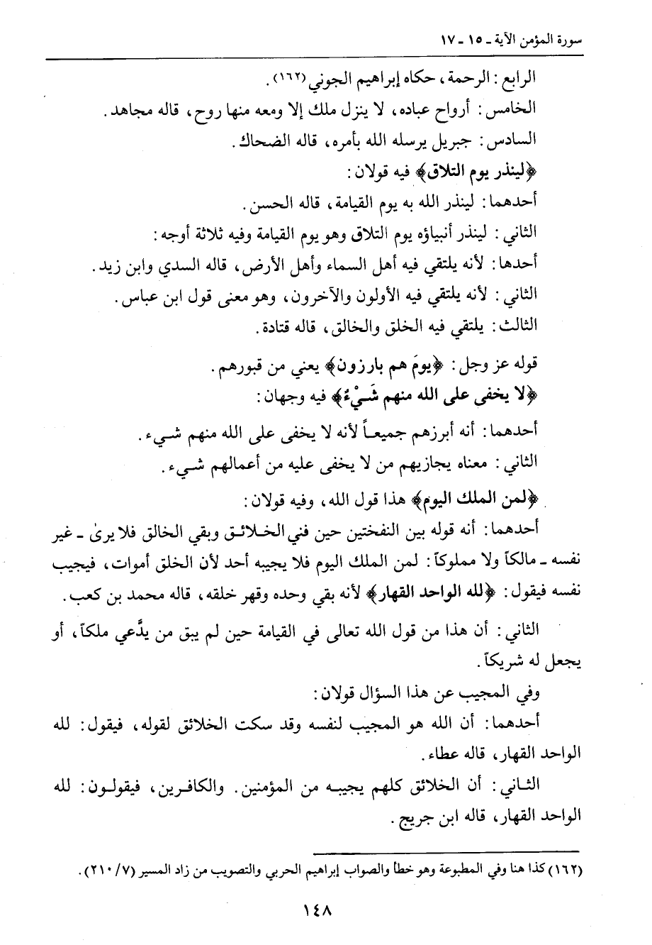 الرابع: الرحمة , حكاه إبراهيم الجوني. الخامس: أرواح عباده , لا ينزل ملك إلا ومعه منها روح , قاله مجاهد. السادس: جبريل يرسله الله بأمره , قاله الضحاك. {لينذر يوم التلاق} فيه قولان: أحدهما: لينذر الله به يوم القيامة , قاله الحسن. الثاني: لينذر أنبياؤه يوم التلاق وهو يوم القيامة وفيه ثلاثة أوجه: أحدها: لأنه يلتقي فيه أهل السماء وأهل الأرض , قاله السدي وابن زيد. الثاني: لأنه يلتقي فيه الأولون والآخرون , وهو معنى قول ابن عباس. الثالث: يلتقي فيه الخلق والخالق , قاله قتادة. قوله عز وجل: {يومَ هم بارزون} يعني من قبورهم. {لا يخفى على الله منهم شَيْءٌ} فيه وجهان: أحدهما: أنه أبرزهم جميعاً لأنه لا يخفى على الله منهم شيء. الثاني: معناه يجازيهم من لا يخفى عليه من أعمالهم شيء. {لمن الملك اليوم} هذا قول الله , وفيه قولان: أحدهما: أنه قوله بين النفختين حين فني الخلائق وبقي الخالق فلا يرى - غير نفسه - مالكاً ولا مملوكاً: لمن الملك اليوم فلا يجيبه لأن الخلق أموات , فيجيب نفسه فيقول: {لله الواحد القهار} لأنه بقي وحده وقهر خلقه , قاله محمد بن كعب. الثاني: أن هذا من قول الله تعالى في القيامة حين لم يبق من يدَّعي ملكاً , أو يجعل له شريكاً. وفي المجيب عن هذا السؤال قولان: أحدهما: أن الله هو المجيب لنفسه وقد سكت الخلائق لقوله، فيقول: لله الواحد القهار، قاله عطاء. الثاني: ان الخلائق كلهم يجيبه من المؤمنين. والكافرين، فيقولون: لله الواحد القهار، قاله ابن جريج.