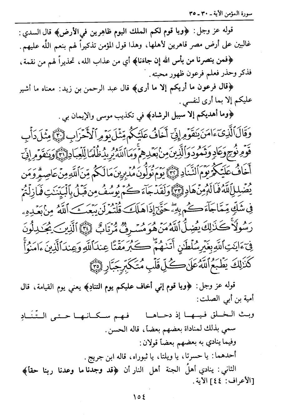 {وقال الذي آمن يا قوم إني أخاف عليكم مثل يوم الأحزاب مثل دأب قوم نوح وعاد وثمود والذين من بعدهم وما الله يريد ظلما للعباد ويا قوم إني أخاف عليكم يوم التناد يوم تولون مدبرين ما لكم من الله من عاصم ومن يضلل الله فما له من هاد ولقد جاءكم يوسف من قبل بالبينات فما زلتم في شك مما جاءكم به حتى إذا هلك قلتم لن يبعث الله من بعده رسولا كذلك يضل الله من هو مسرف مرتاب الذين يجادلون في آيات الله بغير سلطان أتاهم كبر مقتا عند الله وعند الذين آمنوا كذلك يطبع الله على كل قلب متكبر جبار} قوله عز وجل: {ويا قوم إني أخاف عليكم يوم التنادِ} يعني يوم القيامة , قال أمية بن أبي الصلت: