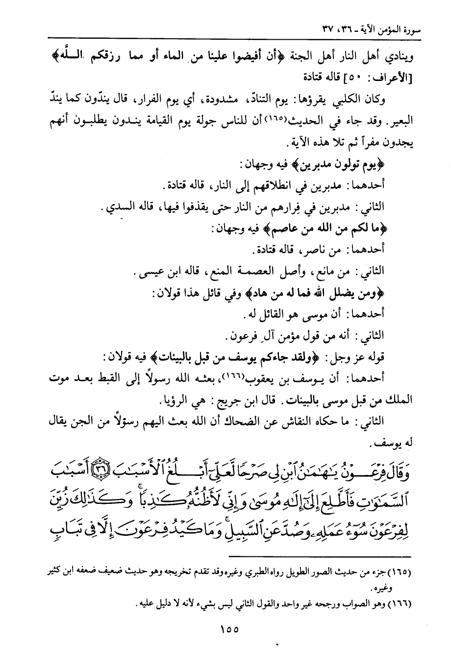 {ما لكم من الله من عاصم} فيه وجهان: أحدهما: من ناصر , قاله قتادة. الثاني: من مانع , وأصل العصمة المنع , قاله ابن عيسى. {ومن يضلل الله فما له من هاد} وفي قائل هذا قولان: أحدهما: أن موسى هو القائل له. الثاني: أنه من قول مؤمن آلِ فرعون. قوله عز وجل: {ولقد جاءكم يوسف من قبل بالبينات} فيه قولان: أحدهما: أن يوسف بن يعقوب , بعثه الله رسولاً إلى القبط بعد موت الملك من قبل موسى بالبينات. قال ابن جريج: هي الرؤيا. الثاني: ما حكاه النقاش عن الضحاك أن الله بعث اليهم رسولاً من الجن يقال له يوسف.
