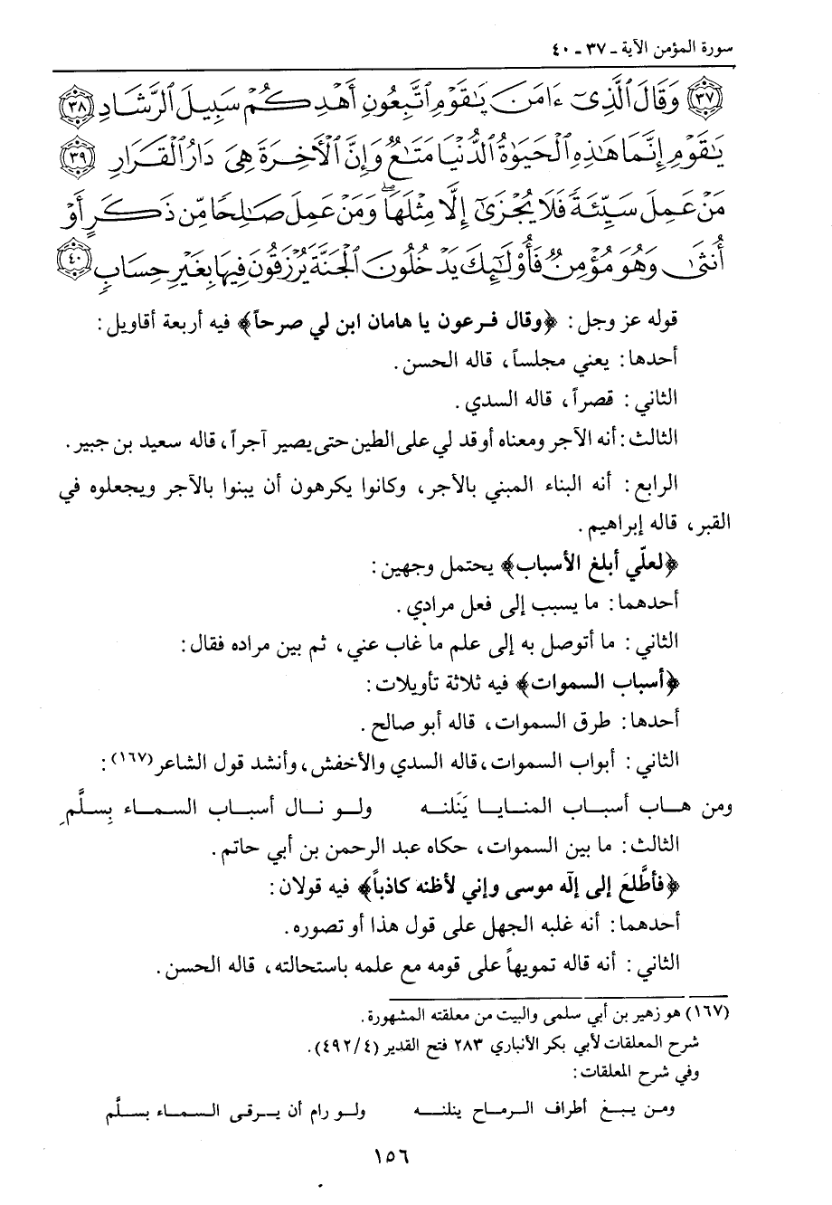 وقال الذي آمن يا قوم اتبعون أهدكم سبيل الرشاد يا قوم إنما هذه الحياة الدنيا متاع وإن الآخرة هي دار القرار من عمل سيئة فلا يجزى إلا مثلها ومن عمل صالحا من ذكر أو أنثى وهو مؤمن فأولئك يدخلون الجنة يرزقون فيها بغير حساب} قوله عز وجل: {وقال فرعون يا هامان ابن لي صرحاً} فيه أربعة أقاويل: أحدها: يعني مجلساً، قاله الحسن. الثاني: قصراً، قاله السدي. الثالث: أنه الآجر ومعناه أوقد لي على الطين حتى يصير آجراً , قاله سعيد بن جبير. الرابع: أنه البناء المبني بالآجر، وكانوا يكرهون أن يبنوا بالآجر ويجعلوه في القبر , قاله إبراهيم. {لعلّي أبلغ الأسباب} يحتمل وجهين: أحدهما: ما يسبب إلى فعل مرادي. الثاني: ما أتوصل به إلى علم ما غاب عني , ثم بين مراده فقال: {أسباب السموات} فيه ثلاثة تأويلات: أحدها: طرق السموات , قاله أبو صالح. الثاني: أبواب السموات , قاله السدي والأخفش , وأنشد قول الشاعر: