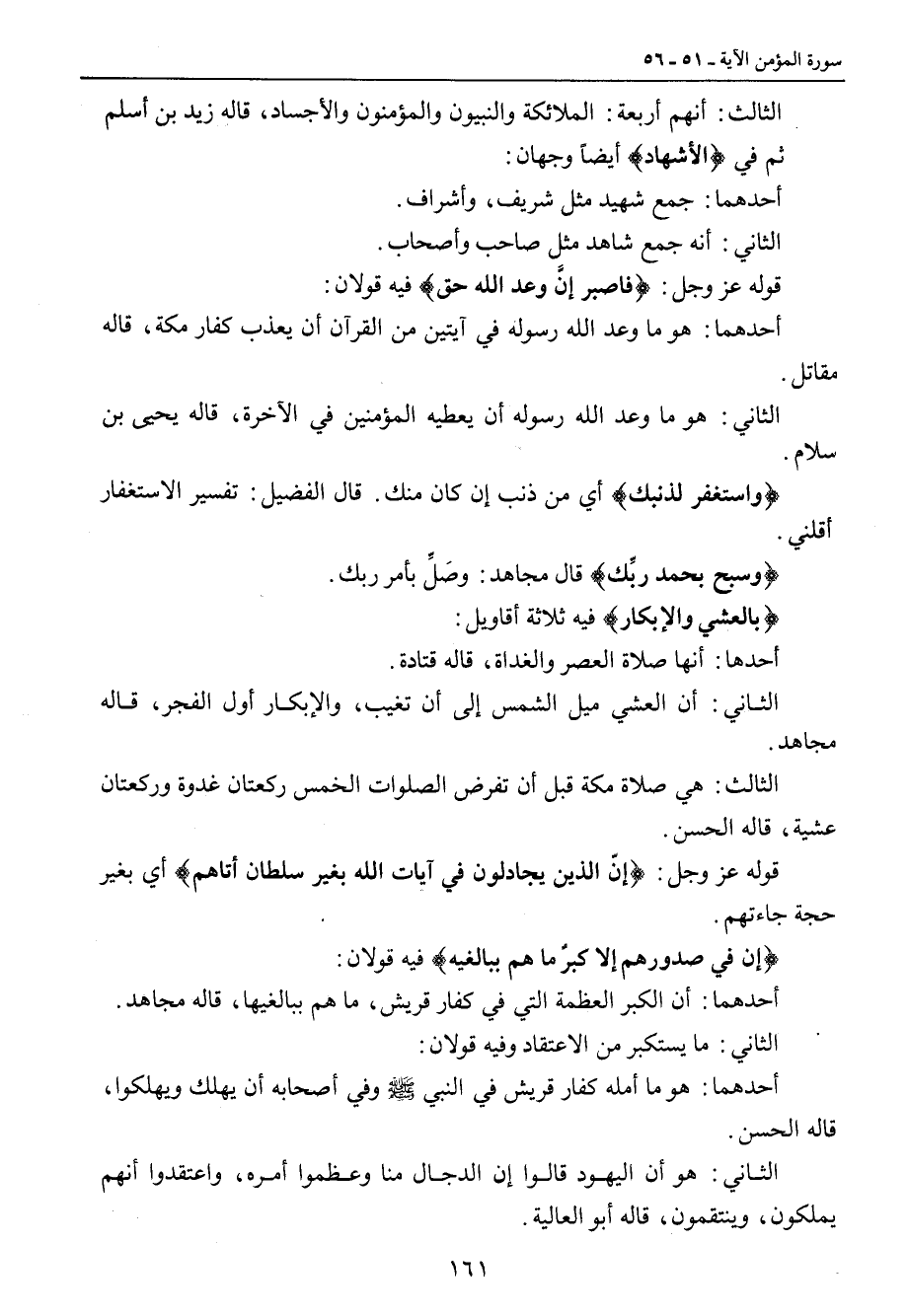 الثالث: أنهم أربعة: الملائكة والنبيون والمؤمنون والأجساد , قاله زيد بن أسلم ثم في {الأشهاد} أيضاً وجهان: أحدهما: جمع شهيد مثل شريف , وأشراف. الثاني: أنه جمع شاهد مثل صاحب وأصحاب. قوله عز وجل: {فاصبر إنَّ وعد الله حق} فيه قولان: أحدهما: هو ما وعد الله رسوله في آيتين من القرآن أن يعذب كفار مكة , قاله مقاتل. الثاني: هو ما وعد الله رسوله أن يعطيه المؤمنين في الآخرة , قاله يحيى بن سلام. {واستغفر لذنبك} اي من ذنب إن كان منك. قال الفضيل: تفسير الاستغفار أقلني. {وسبح بحمد ربِّك} قال مجاهد: وصَلِّ بأمر ربك. {بالعشي والإبكار} فيه ثلاثة أقاويل: أحدها: أنها صلاة العصر والغداة , قاله قتادة. الثاني: أن العشي ميل الشمس إلى أن تغيب , والإبكار أول الفجر , قاله مجاهد. الثالث: هي صلاة مكة قبل أن تفرض الصلوات الخمس ركعتان غدوة وركعتان عشية , قاله الحسن. قوله عز وجل: {إنّ الذين يجادلون في آيات الله بغير سلطان أتاهم} أي بغير حجة جاءتهم. {إن في صدورهم إلا كبرٌ ما هم ببالغيه} فيه قولان: أحدهما: أن اكبر العظمة التي في كفار قريش، ما هم ببالغيها، قاله مجاهد. الثاني: ما يستكبر من الإعتقاد وفيه قولان: أحدهما: هو ما أمله كفار قريش في النبي صلى الله عليه وسلم وفي أصحابه أن يهلك ويهلكوا , قاله الحسن. الثاني: هو أن اليهود قالوا إن الدجال منا وعظموا أمره , واعتقدوا أنهم يملكون، وينتقمون، قاله أبو العالية.