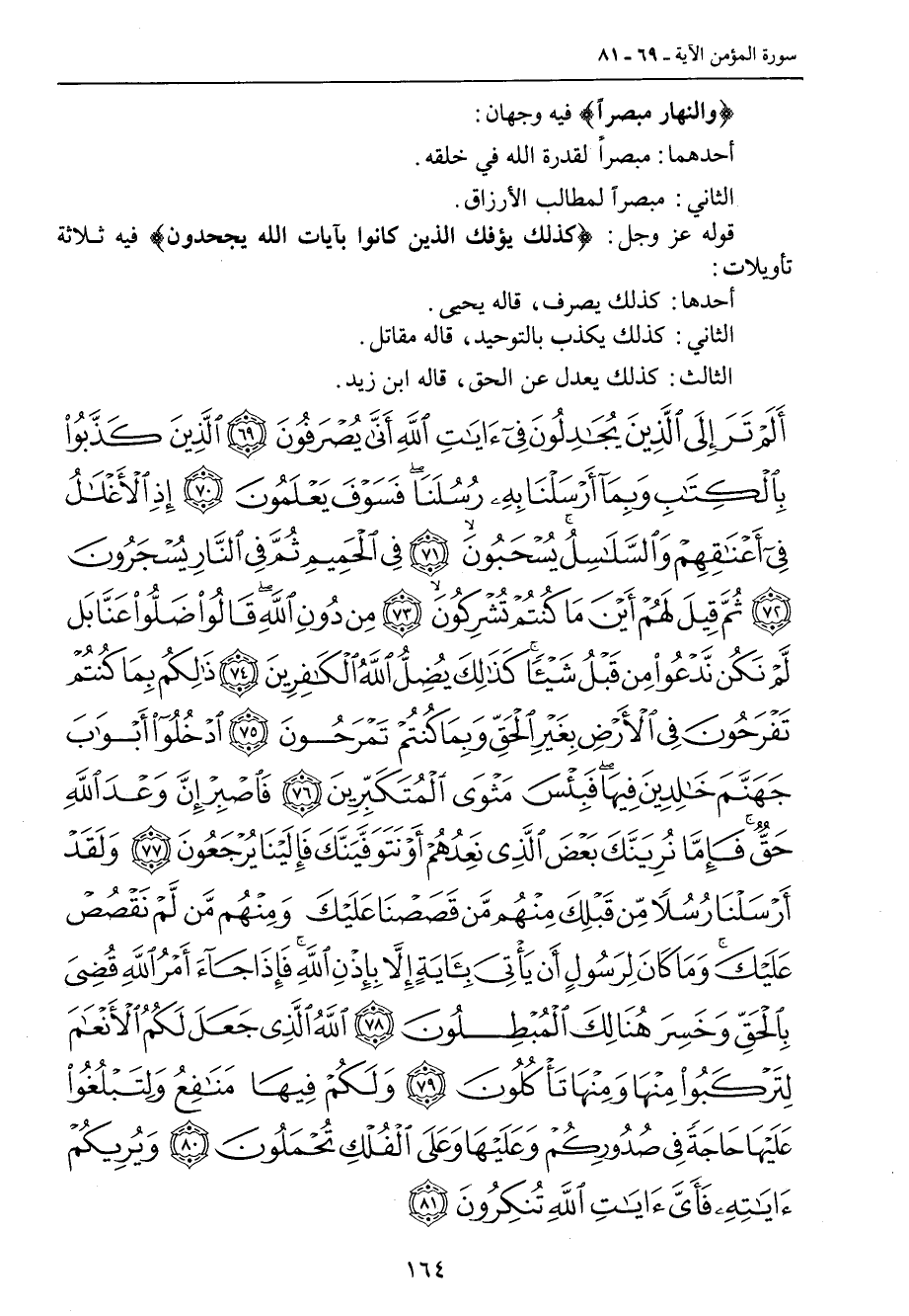 {ألم تر إلى الذين يجادلون في آيات الله أنى يصرفون الذين كذبوا بالكتاب وبما أرسلنا به رسلنا فسوف يعلمون إذ الأغلال في أعناقهم والسلاسل يسحبون في الحميم ثم في النار يسجرون ثم قيل لهم أين ما كنتم تشركون من دون الله قالوا ضلوا عنا بل لم نكن ندعوا من قبل شيئا كذلك يضل الله الكافرين ذلكم بما كنتم تفرحون في الأرض بغير الحق وبما كنتم تمرحون ادخلوا أبواب جهنم خالدين فيها فبئس مثوى المتكبرين فاصبر إن وعد الله حق فإما نرينك بعض الذي نعدهم أو نتوفينك فإلينا يرجعون ولقد أرسلنا رسلا من قبلك منهم من قصصنا عليك ومنهم من لم نقصص عليك وما كان لرسول أن يأتي بآية إلا بإذن الله فإذا جاء أمر الله قضي بالحق وخسر هنالك المبطلون الله الذي جعل لكم الأنعام لتركبوا منها ومنها تأكلون ولكم فيها منافع ولتبلغوا عليها حاجة في صدوركم وعليها وعلى الفلك تحملون ويريكم آياته فأي آيات الله تنكرون}