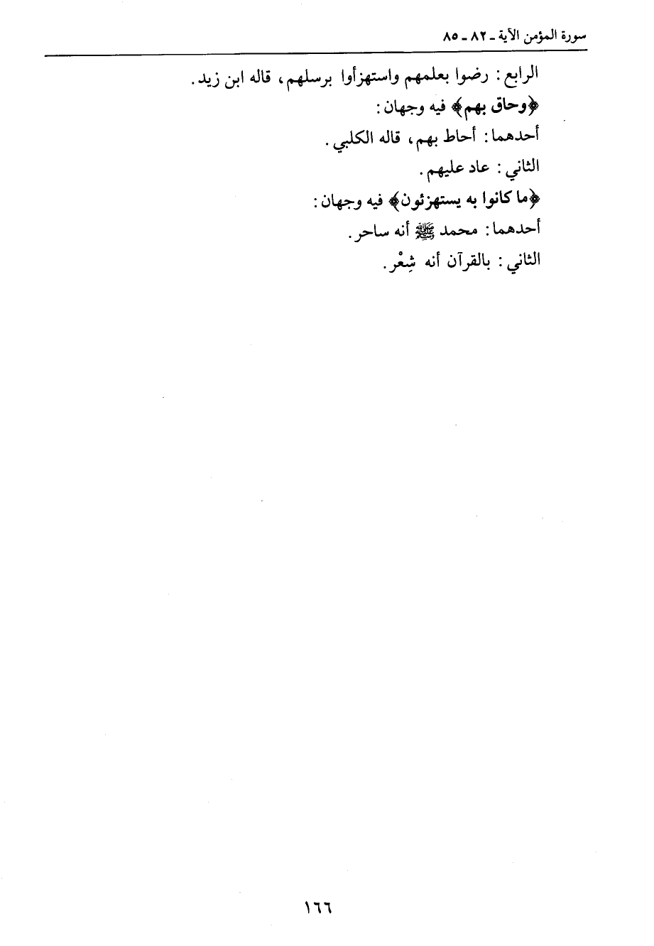 الرابع: رضوا بعلمهم واستهزأوا برسلهم، قاله ابن زيد. {وحاق بهم} فيه وجهان: أحدهما: أحاط بهم , قاله الكلبي. الثاني: عاد عليهم. {ما كانوا به يستهزئون} فيه وجهان: أحدهما: محمد صلى الله عليه وسلم أنه ساحر. الثاني: بالقرآن أنه شِعْر.
