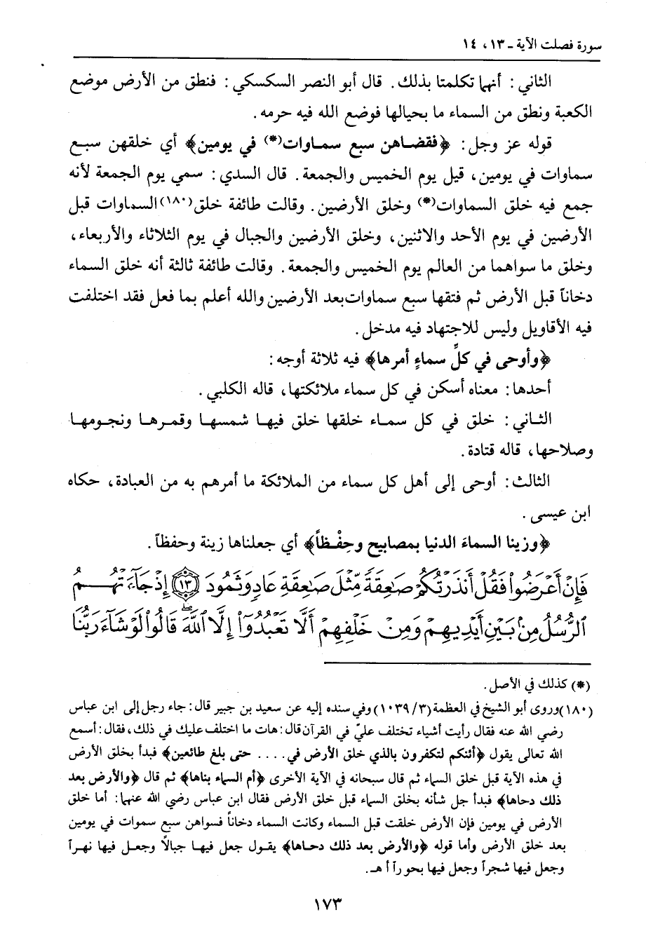 الثاني: أنهما تكلمتا بذلك. قال أبو النصر السكسكي: فنطق من الأرض موضع الكعبة ونطق من السماء ما بحيالها فوضع الله فيها حرمه. قوله عز وجل: {فقضاهن سبع سماوات في يومين} أي خلقهن سبع سماوات في يومين , قيل يوم الخميس والجمعة , قال السدي: سمي يوم الجمعة لأنه جمع فيه خلق السماوات وخلق الأرضين. وقالت طائفة خلق السماوات قبل الأرضين في يوم الأحد والاثنين , وخلق الأرضين والجبال في يوم الثلاثاء والأربعاء , وخلق ما سواهما من العالم يوم الخميس والجمعة , وقالت طائفة ثالثة أنه خلق السماء دخاناً قبل الأرض ثم فتقها سبع سماوات بعد الأرضين والله أعلم بما فعل فقد اختلفت فيه الأقاويل وليس للاجتهاد فيه مدخل. {وأوحى في كلِّ سماءٍ أمرها} فيه ثلاثة أوجه: أحدها: معناه أسكن في كل سماء ملائكتها , قاله الكلبي. الثاني: خلق في كل سماء خلقها خلق فيها شمسها وقمرها ونجومها وصلاحها , قاله قتادة. الثالث: أوحى إلى أهل كل سماء من الملائكة ما أمرهم به من العبادة , حكاه ابن عيسى. {وزينا السماءَ الدنيا بمصابيح وحِفْظاً} أي جعلناها زينة وحفظاً.