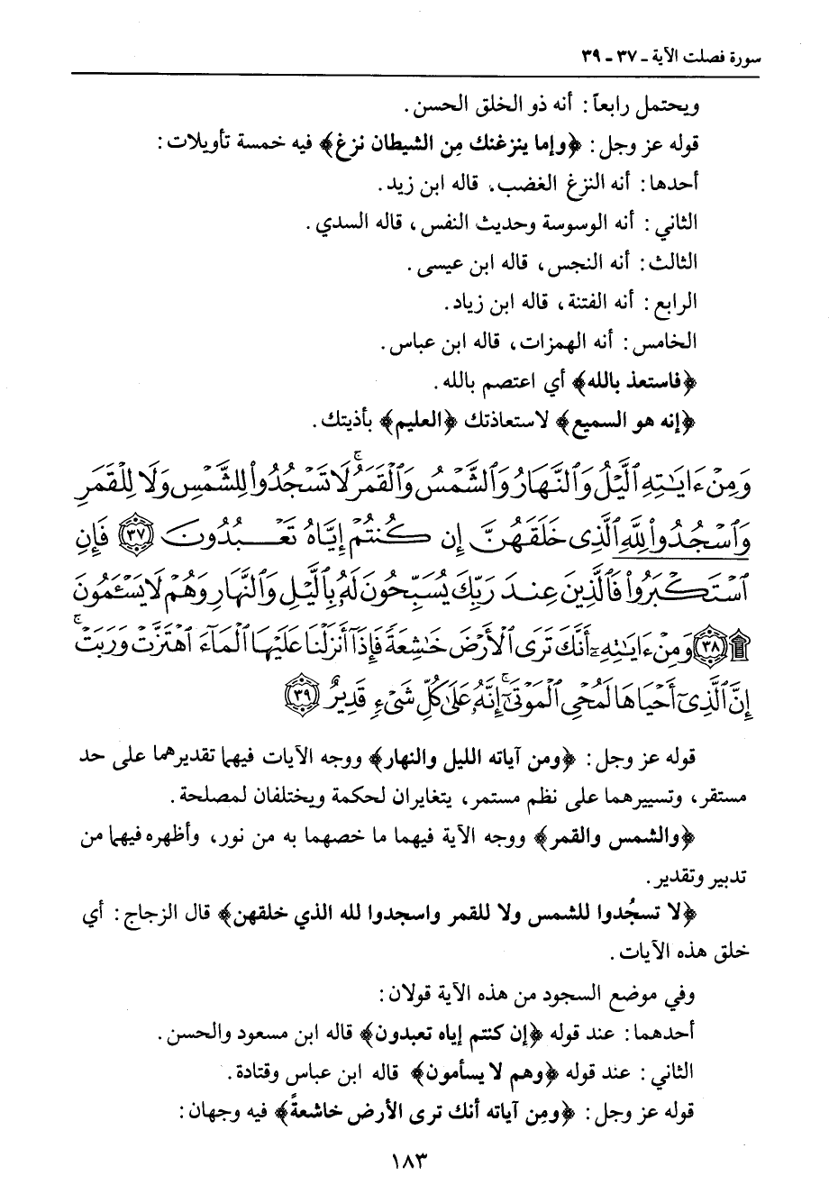 {ومن آياته الليل والنهار والشمس والقمر لا تسجدوا للشمس ولا للقمر واسجدوا لله الذي خلقهن إن كنتم إياه تعبدون فإن استكبروا فالذين عند ربك يسبحون له بالليل والنهار وهم لا يسأمون ومن آياته أنك ترى الأرض خاشعة فإذا أنزلنا عليها الماء اهتزت وربت إن الذي أحياها لمحيي الموتى إنه على كل شيء قدير} قوله عز وجل: {ومن آياته الليل والنهار} ووجه الآيات فيهما تقديرهما على حد مستقر , وتسييرهما على نظم مستمر , يتغايران لحكمة ويختلفان لمصلحة. {والشمس والقمر} ووجه الآية فيهما ما خصهما به من نور , وأظهره فيهما من تدبير وتقدير. {لا تسجُدوا للشمس ولا للقمر واسجدوا لله الذي خلقهن} قال الزجاج: أي خلق هذه الآيات. وفي موضع السجود من هذه الآية قولان: أحدهما: عند قوله {إن كنتم إياه تعبدون} قاله ابن مسعود والحسن. الثاني: عند قوله {وهم لا يسأمون} قاله ابن عباس وقتادة. قوله عز وجل: {ومِن آياته أنك ترىالأرض خاشعةً} فيه وجهان: