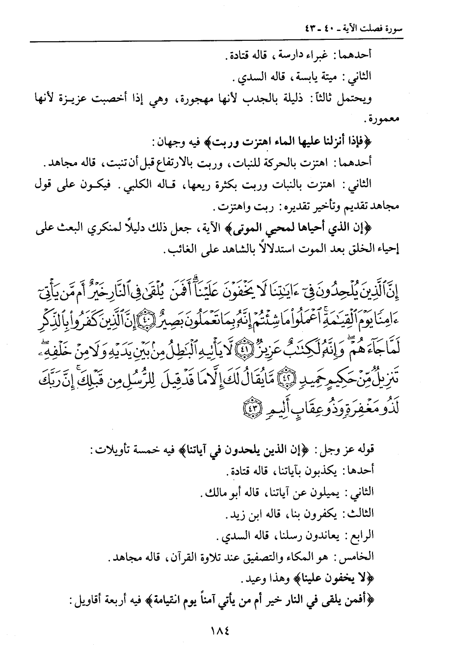 {إن الذين يلحدون في آياتنا لا يخفون علينا أفمن يلقى في النار خير أم من يأتي آمنا يوم القيامة اعملوا ما شئتم إنه بما تعملون بصير إن الذين كفروا بالذكر لما جاءهم وإنه لكتاب عزيز لا يأتيه الباطل من بين يديه ولا من خلفه تنزيل من حكيم حميد ما يقال لك إلا ما قد قيل للرسل من قبلك إن ربك لذو مغفرة وذو عقاب أليم} قوله عز وجل: {إن الذين يلحدون في آياتنا} فيه خمسة تأويلات: أحدها: يكذبون بآياتنا، قاله قتادة. الثاني: يميلون عن آياتنا، قاله أبو مالك. الثالث: يكفرون بنا، قاله ابن زيد. الرابع: يعاندون رسلنا، قاله السدي. الخامس: هو المكاء والتصفيق عند تلاوة القرآن، قاله مجاهد. {لا يخفون علينا} وهذا وعيد. {أفمن يلقى في النار خير أم من يأتي آمناً يوم القيامة} فيه أربعة أقاويل: