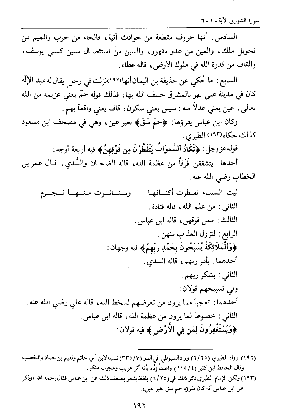 السادس: أنها حروف مقطعة من حوادث آتية , فالحاء من حرب والميم من تحويل ملك، والعين من عدو مقهور، والسين من استئصال سنين كسني يوسف، والقاف من قدرة الله في ملوك الأرض، قاله عطاء. السابع: ما حُكي عن حذيفة بن اليمان أنها نزلت في رجلٍ يقال له عبد الإله كان في مدينة على نهر بالمشرق خسف الله بها، فذلك قوله حم يعني عزيمة من الله تعالى، عين يعني عدلاً منه: سين يعني سكون، قاف يعني واقعاً بهم. وكان ابن عباس يقرؤها: {حم سق} بغير عين , وهي في مصحف ابن مسعود كذلك حكاه الطبري. قوله عز وجل: {تَكَادُ السَّمَواتُ يَتَفَطَّرْنَ مِن فَوْقِهِنَّ} فيه أربعة أوجه: أحدها: يتشققن فَرَقاً من عظمة الله , قاله الضحاك والسُّدي، قال عمر بن الخطاب رضي الله عنه: