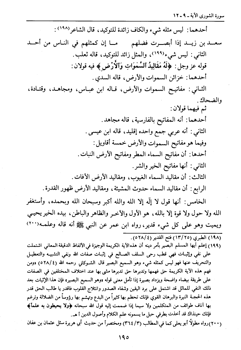 الثاني: ليس شيء , والمثل زائد للتوكيد , قاله ثعلب. قوله عز وجل: {لَهُ مَقَالِيدُ السَّموَاتِ وَالأَرْضِ} فيه قولان: أحدهما: خزائن السموات والأرض , قاله السدي. الثاني: مفاتيح السموات والأرض , قاله ابن عباس , ومجاهد , وقتادة , والضحاك. ثم فيهما قولان: أحدهما: أنه المفاتيح بالفارسية , قاله مجاهد. الثاني: أنه عربي جمع واحده إقليد، قاله ابن عيسى. وفيما هو مفاتيح السموات والأرض خمسة أقاويل: أحدها: أن مفاتيح السماء المطر ومفاتيح الأرض النبات. الثاني: أنها مفاتيح الخير والشر. الثالث: أن مقاليد السماء الغيوب , ومقاليد الأرض الآفات. الرابع: أن مقاليد السماء حدوث المشيئة , ومقاليد الأرض ظهور القدرة. الخامس: أنها قول لا إله إلا الله والله أكبر وسبحان الله وبحمده , وأستغفر الله ولا حول ولا قوة إلا بالله، هو الأول والآخر والظاهر والباطن، بيده الخير يحيي ويميت وهوعلى كل شيء قدير، رواه ابن عمر عن النبي صلى الله عليه وسلم أنه قاله وعلمه